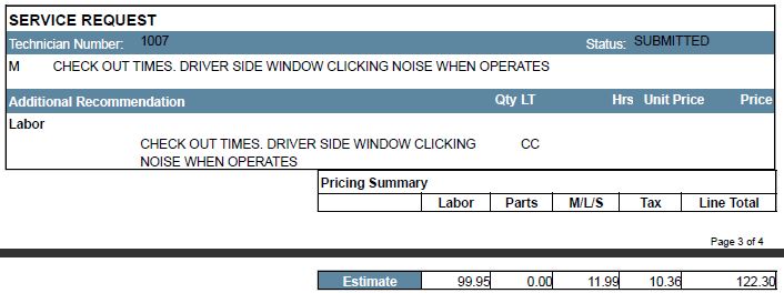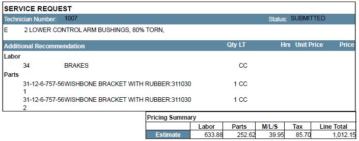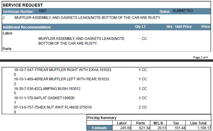 And today we had another car ('06 S w/ 76k miles) inspected at Mini of Nashville. It has several items, but all seem to be about normal for this age of car. Other than a complete brake job (expected), some bulbs, and an oil change, the attached excerpts from the quote list what's needed.