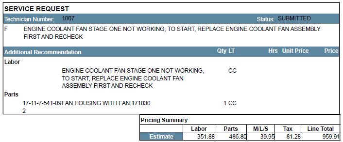 It's not working in stage one. The dealer priced out replacing the fan (PN 17-11-7-541-092).