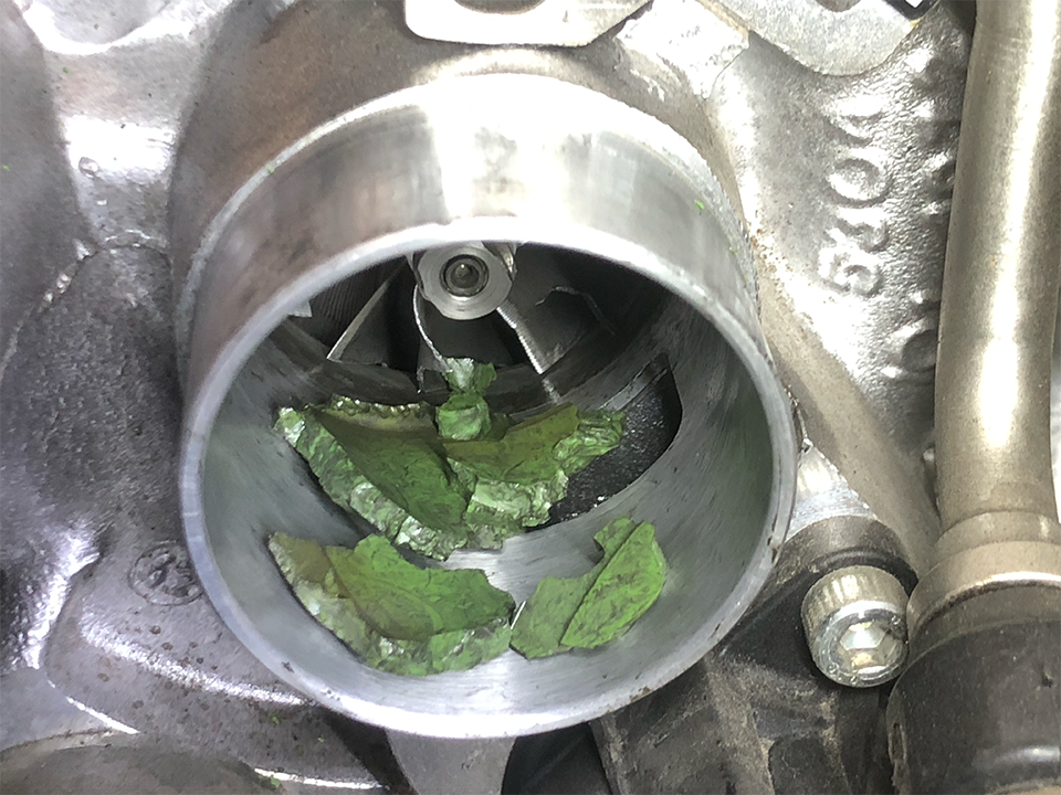 Now the tube/rubber seal isn't a huge deal in itself to obtain a replacement part, but the real problem was all the secondary damage. Immediately obvious was that the compressor wheel itself had lots of bent fins & a couple of missing chunks. So I dug deeper to assess the extent of this mess.