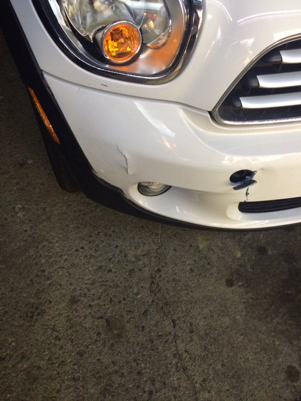 This is the 1st car that I really drove well. No hitting things in my garage and I'm actually really good at parallel parking it. For whatever reason when I had a smaller mini those 2 things were challenges for me. So I'm just a bit bummed. The bumper is cracked, my hood has a big black mark, and the fender trim isn't aligned.