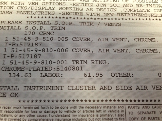 The torque gauge has a little rattle that's bugging me...hopefully I can resolve it...if not my service guy said come by and they'll take a look. All my paperwork is at the office... I can verify exact part #'s, correct color descriptions etc tomorrow. Dealer did the install and was around $65. The 2 vent trims along with the mini mouse trim was around $125. I believe. Again I'll confirm everything in the morning. The expensive items were the gauges...around $540 and install was close to 450.