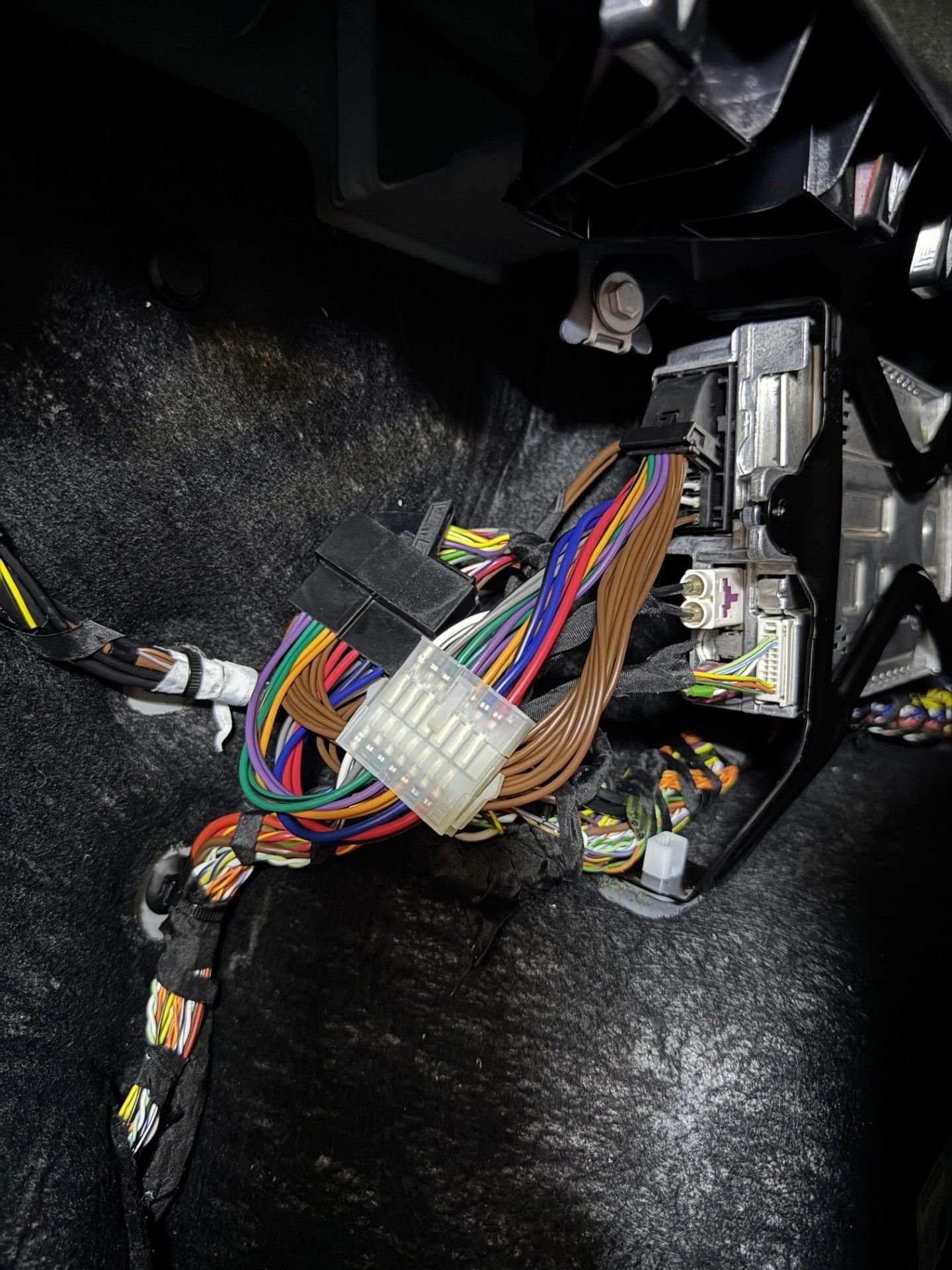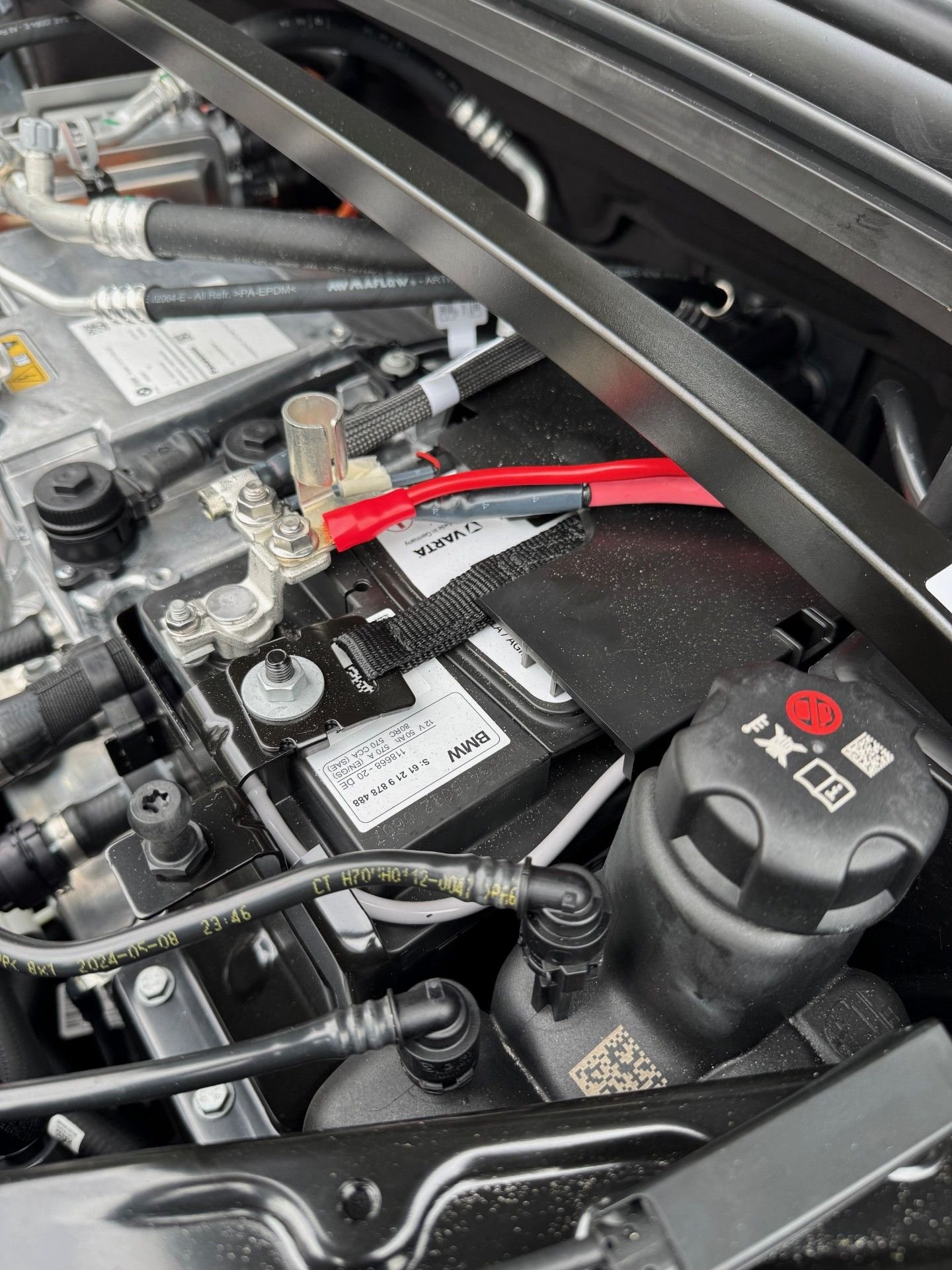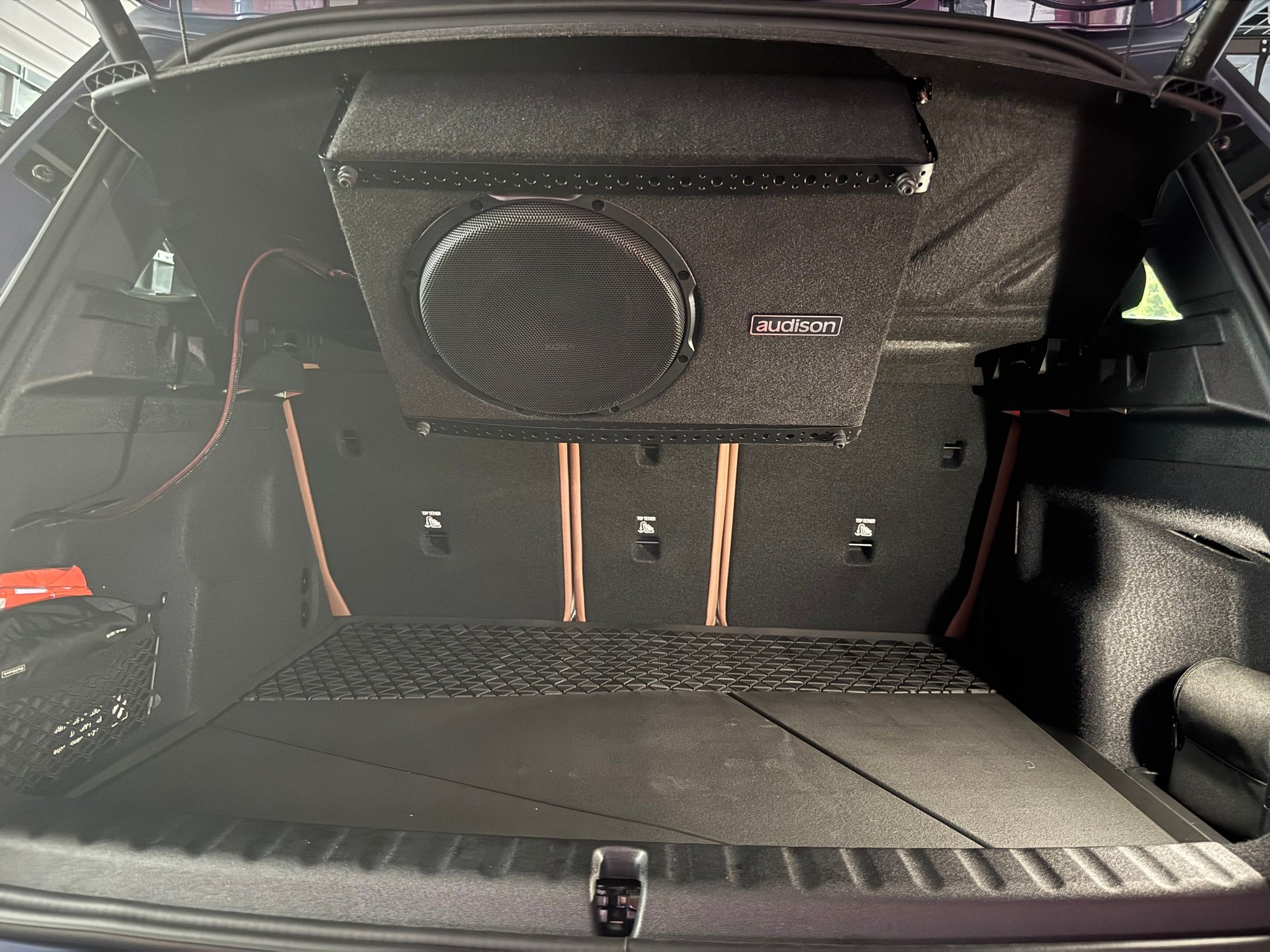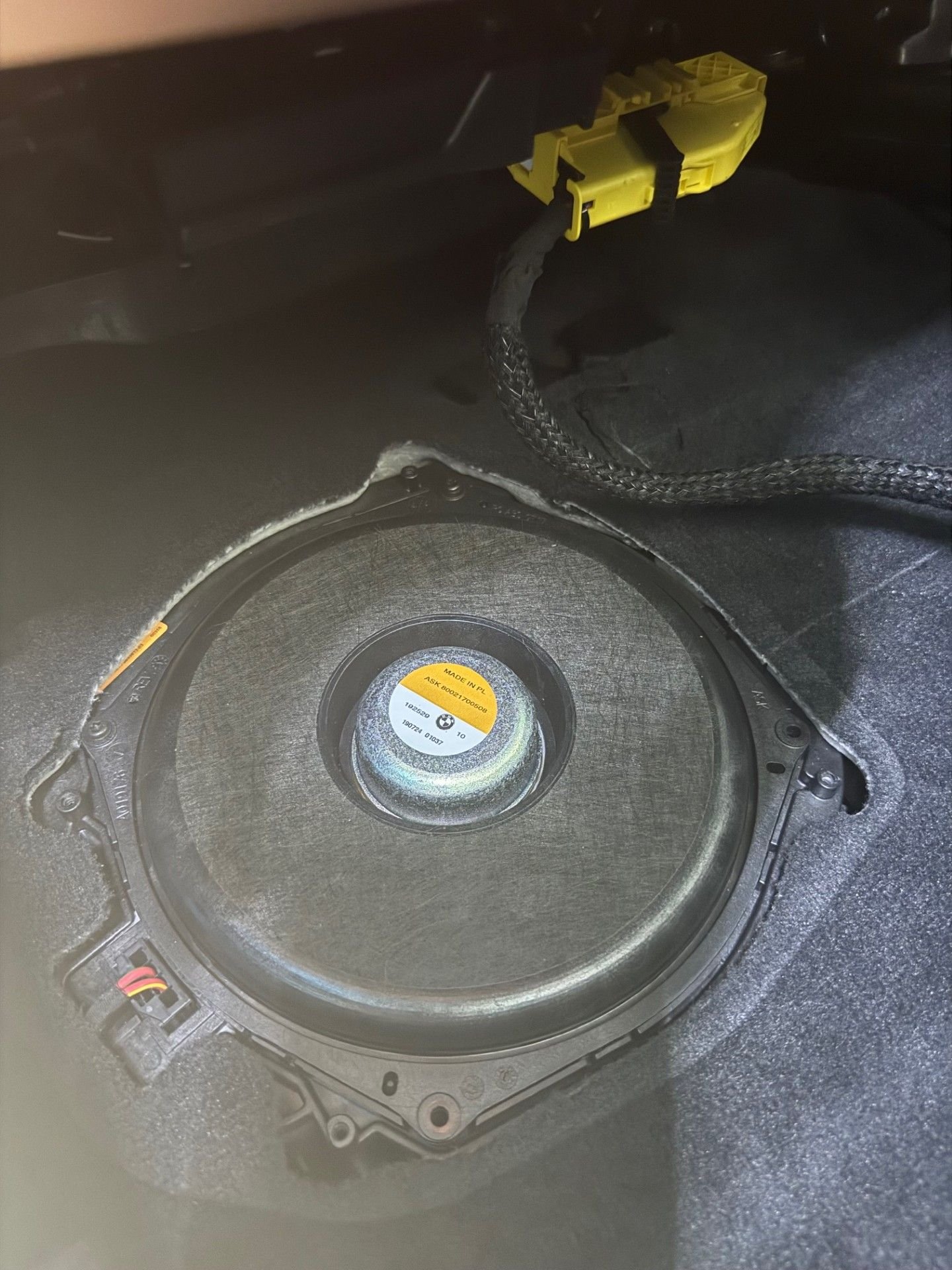 No 12V battery terminal in hatch (like in BMW), 12V cable must be connected directly to battery 50A fuse/cable run thru bulkhead grommet. All plugged in. OEM woofer Morel woofer plugged in.
