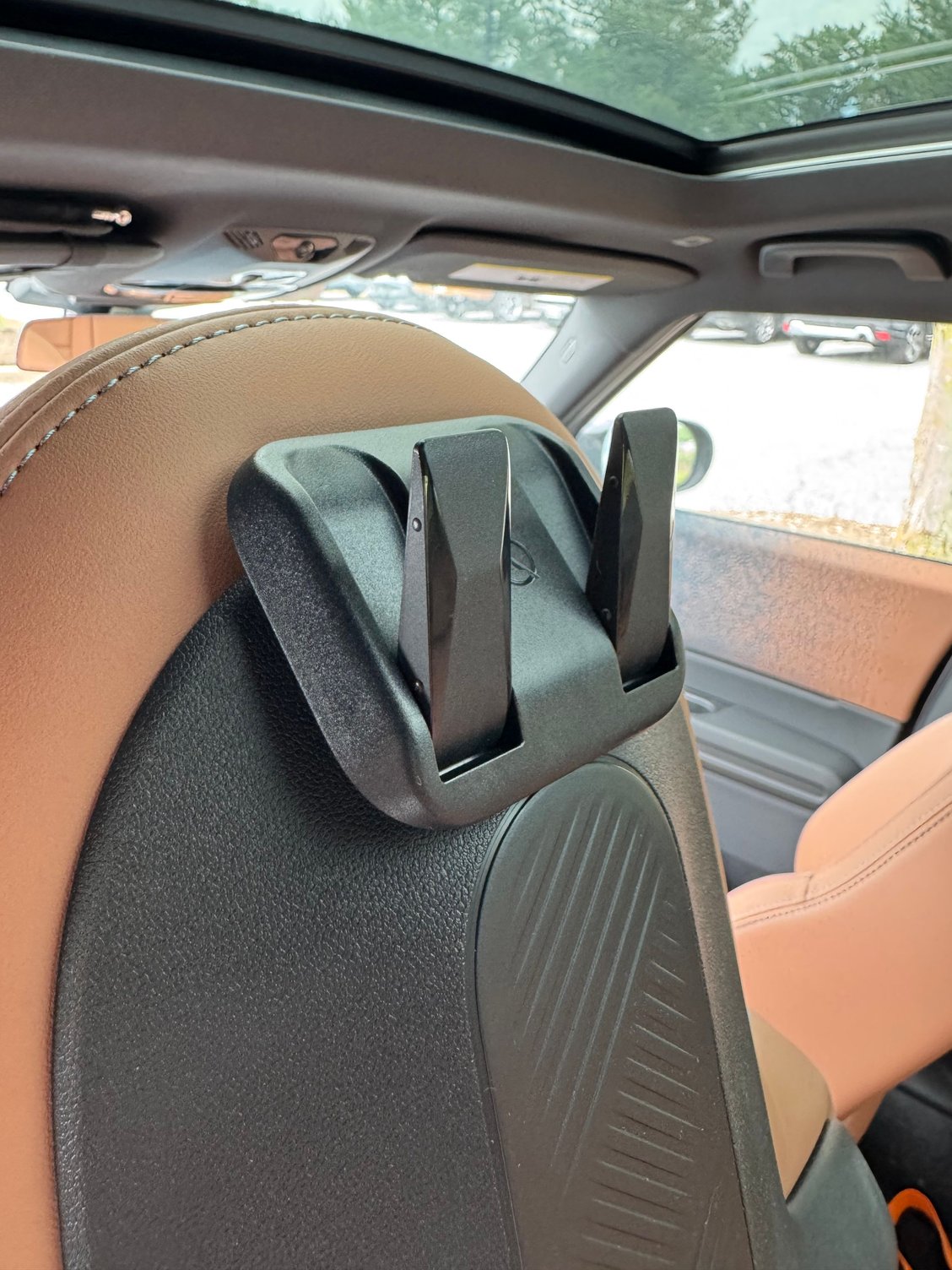 I replaced the other powder coated metal “Tesla” car seat hooks with another set from HALOBLK and they’re much better suited to the Countryman. Though not as stealthy as on a Tesla it’s a much more streamlined design with it clipping snugly between the plastic backer panel and the Vescin at the top of the headrest and I doubt it’ll easily slip out (I kept accidentally dislodging the metal one and sending it flying while pulling up my backpack hanging off top of the seat).