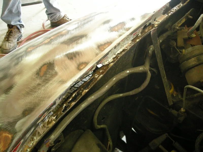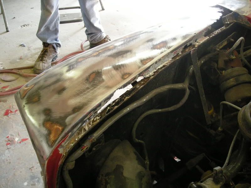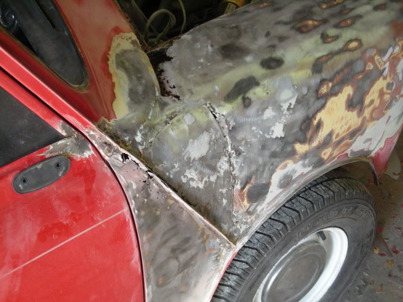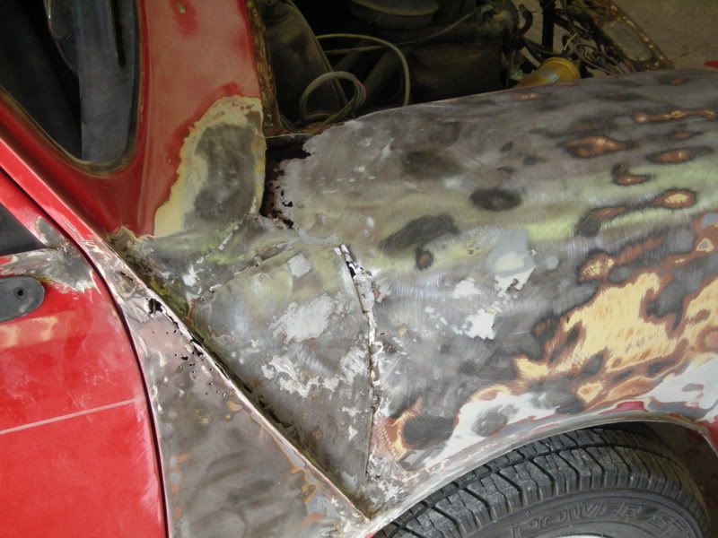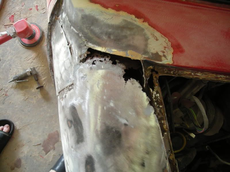 the bondo on this car was applied over fiberblass that was applied over rust....it was a lipstick job.......to avoid replacing panels all together, were gonna cut out the rust and patch in new metal.....of course we will have to skim it all with bondo to get a nice smooth surfave for paint, but the key is to do it all correctly.......