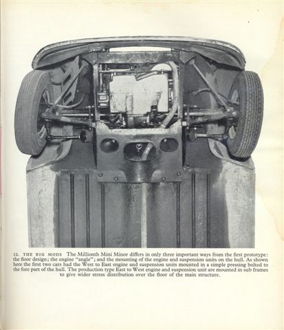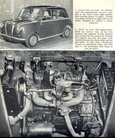Interesting collection of photos of the two experimental Mini prototypes built and used for testing from October 1957, most of which have appeared in the various Mini books over the years except for the worm's-eye view pre-front subframe photo which is rarely seen. They were nicknamed "Orange Boxes" disguised with Austin A35 grilles and mainly tested at night. The under bonnet/hood photos clearly show the 950cc A-Series engine mounted the opposite way round to later production Minis, reasons for the change were given as carburettor icing and weak A35 gearbox syncro problems. The changes required the addition of a third drop or idler gear and also changed the cooling fan from sucking air in, to pushing air out into the other front wheel arch more efficiently. The 950cc engine was also reduced to 850cc to keep top speed down relative to the early braking power available at the time!