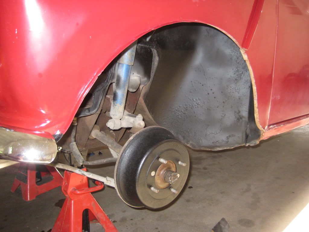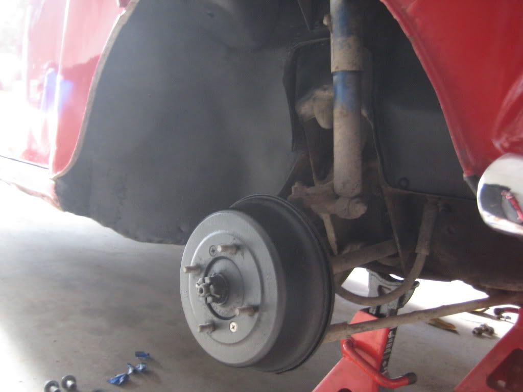 Grinded down the surface rust, primered and painted the wheel wells as well. Painted the drums black too