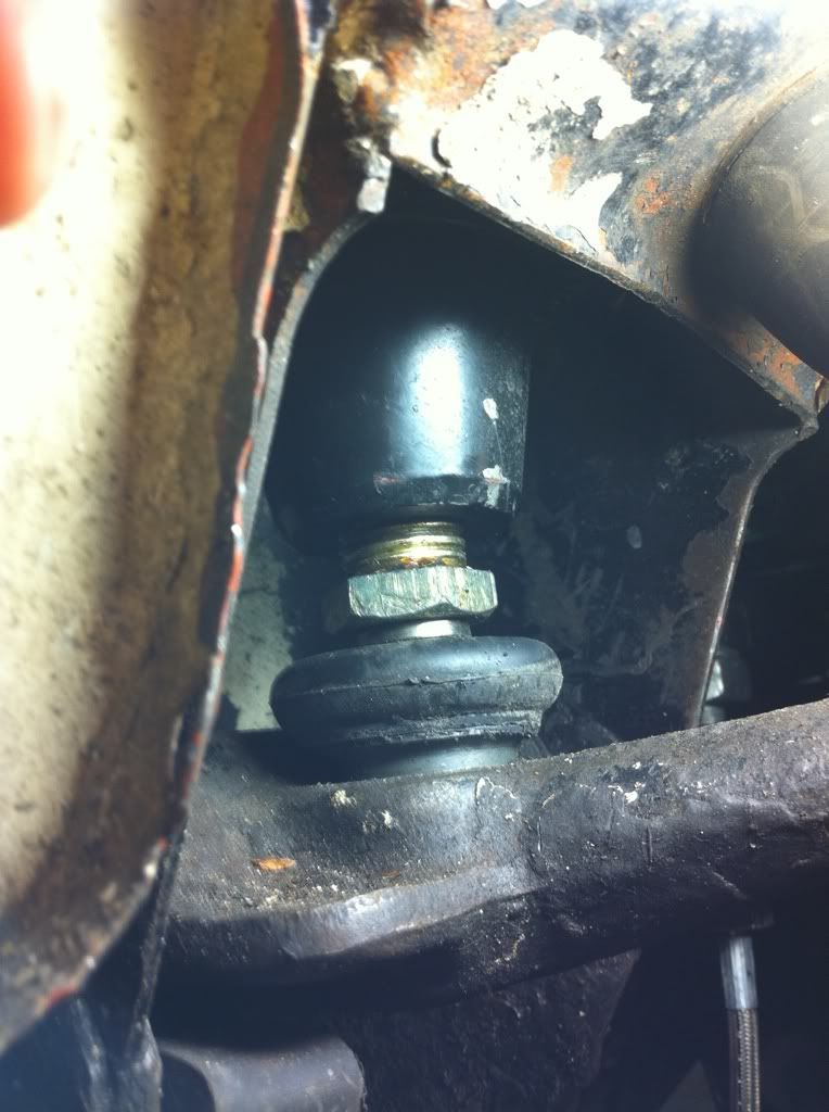 then loosen the nut (11/16 or 3/4", can't remember wrench size for sure) on the back side of the subframe that hold the top arm pivot shaft. (No need to undo the front nut of the same size.) You won't be able to remove it entirely just yet because it's too close to the firewall. Just unthread a few turns for now.