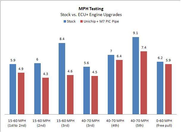 The first test was done with no engine modifications to the vehicle and is represented by the blue bar in the following graph. The second test was done with the Unichip module and M7 PIC Pipe installed and is represented by the maroon bar in the graph.