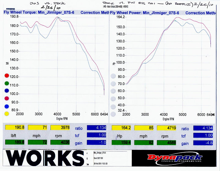 As you see in the chart above comparing the DoS CAI with the stock airbox on an R56 MCS (with a stock tune). There are nice Hp and torque gains to be had in the midrange as well as the upper range Hp gains mentioned above. This is the range that we use the most anyway on the street and on club runs.