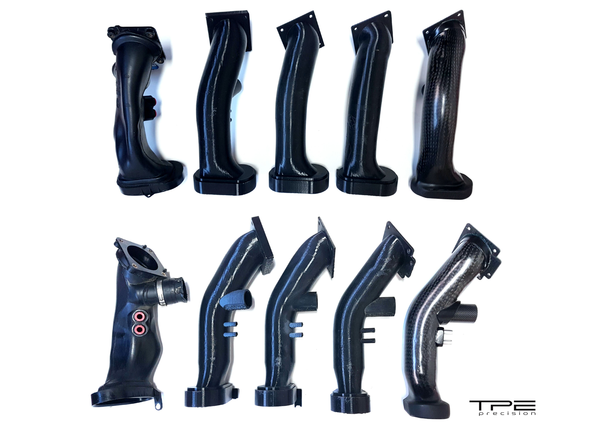 So far : Countless design (CAD modelling) hours and air flow (CFD) simulations, 8 3D printed prototypes (3 in the picture), 2 engine 3D scans and 2 pre-production carbon fiber models. (I haven't include the 3d models and prototypes of the heatshield... ) I put side by side the OEM ,some printed models and the latest carbon fiber charge pipe so not only you can see the difference between stock and the new design but also how from version to version the design changes a bit.