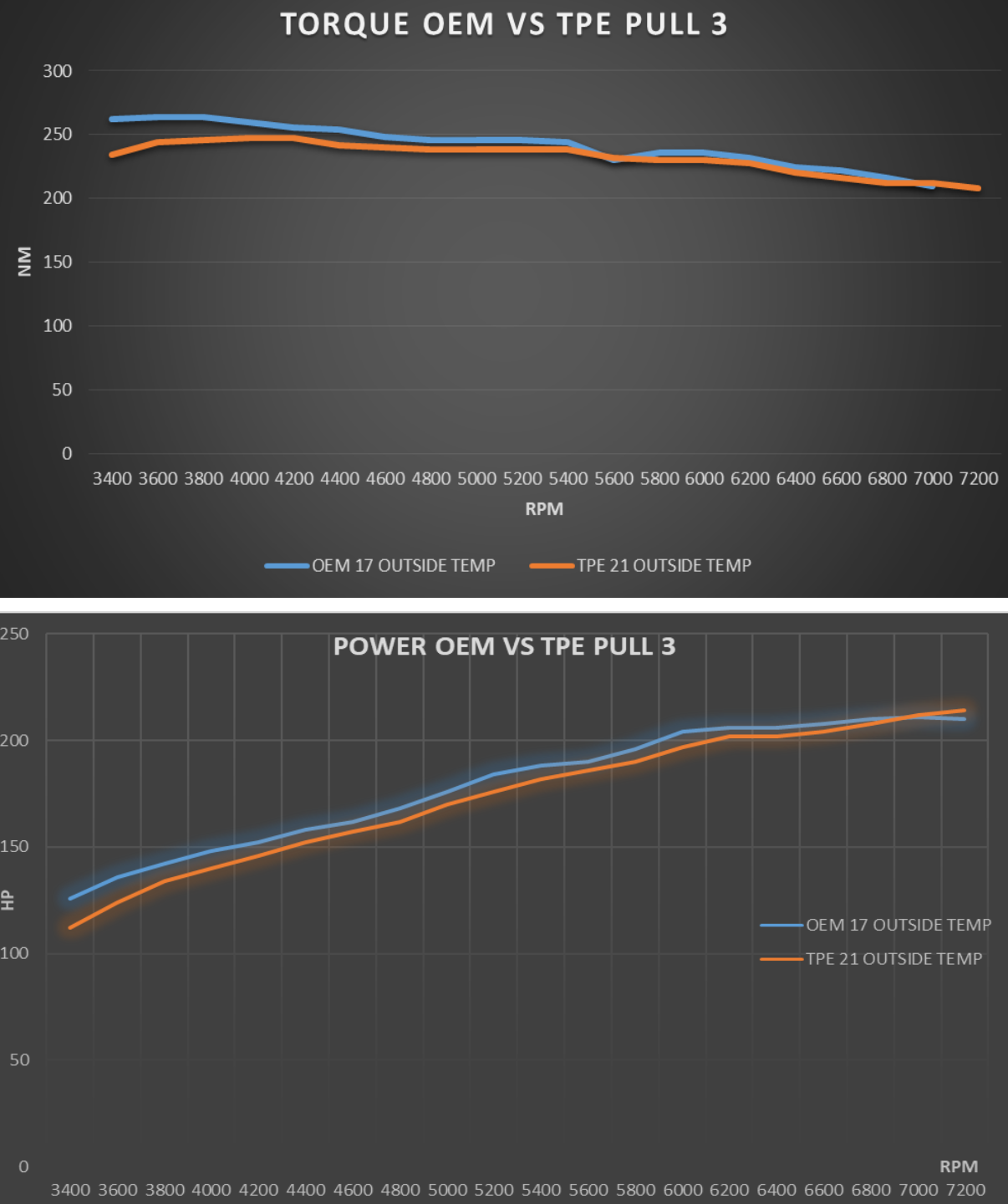 I did 3 pulls each time. 3 with OEM setup and 3 with the new charge pipe. Unfortunately when measuring the carbon charge pipe the temperature was 21 (instead of 17) and by the end of the 3rd dyno section the temperature was 24 degrees Celsius outside. Car felt unwilling to rev in the first pull, second pull a bit better, third again a bit better…. Ok that was weird, I didn’t like it…. With this setup the car has done nearly 500km, maybe it needs some adaptation time ? I don't know.