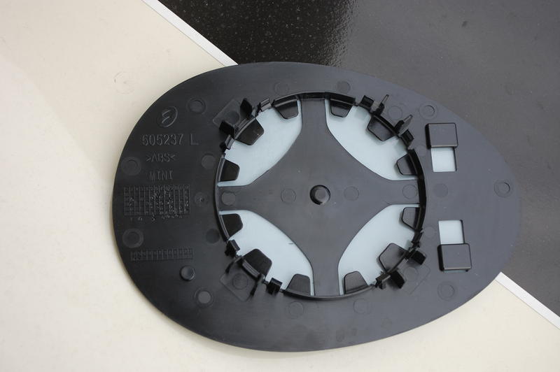 I just pulled the driver side mirror glass off our R57S convertible. I've attached a picture of the back of it.