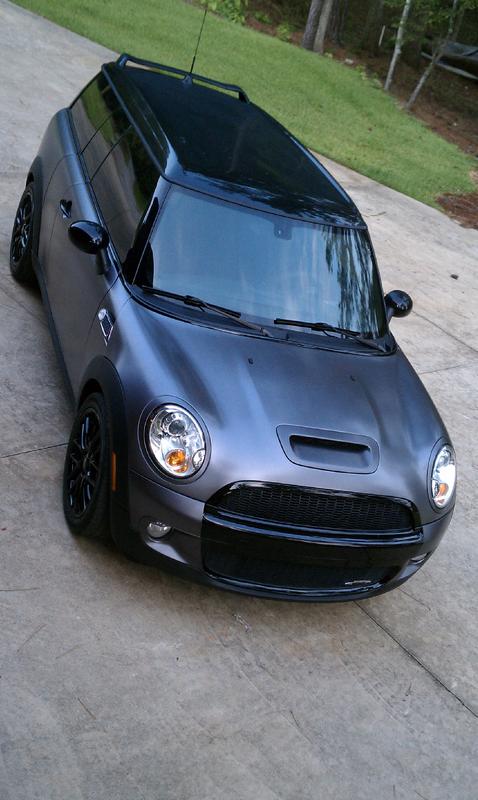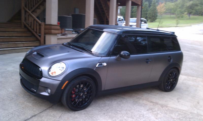 My 2009 Chili Red JCW Clubbie got hammered with hail recently. Thus, I took the opportunity to completely re-do the color scheme. I went with a Bentley color (Dark Grey Satin). Its flat/satin sheen has a better then expected contrast with the gloss black roof, wheels and accent pieces. Now I just have to figure out how to clean it???