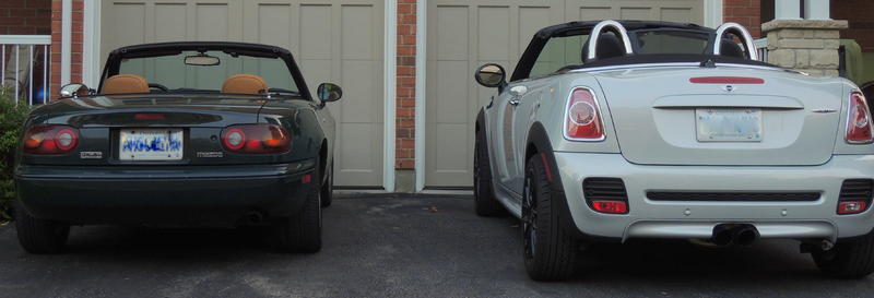 I thought you might be interested in a visual comparison between a 1992 Miata and 2013 Roadster. I took a grab shot of our two Roadsters "side by each" and the MINI is maxi in comparison. Still loving the '92 and really loving the '13.