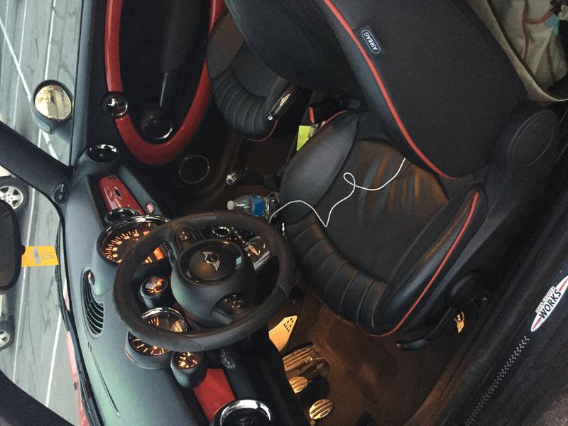 Nice, looks like someone spent some money on the interior options. Nice alcantara / leather JCW steering wheel. even has the JCW sport gauges.