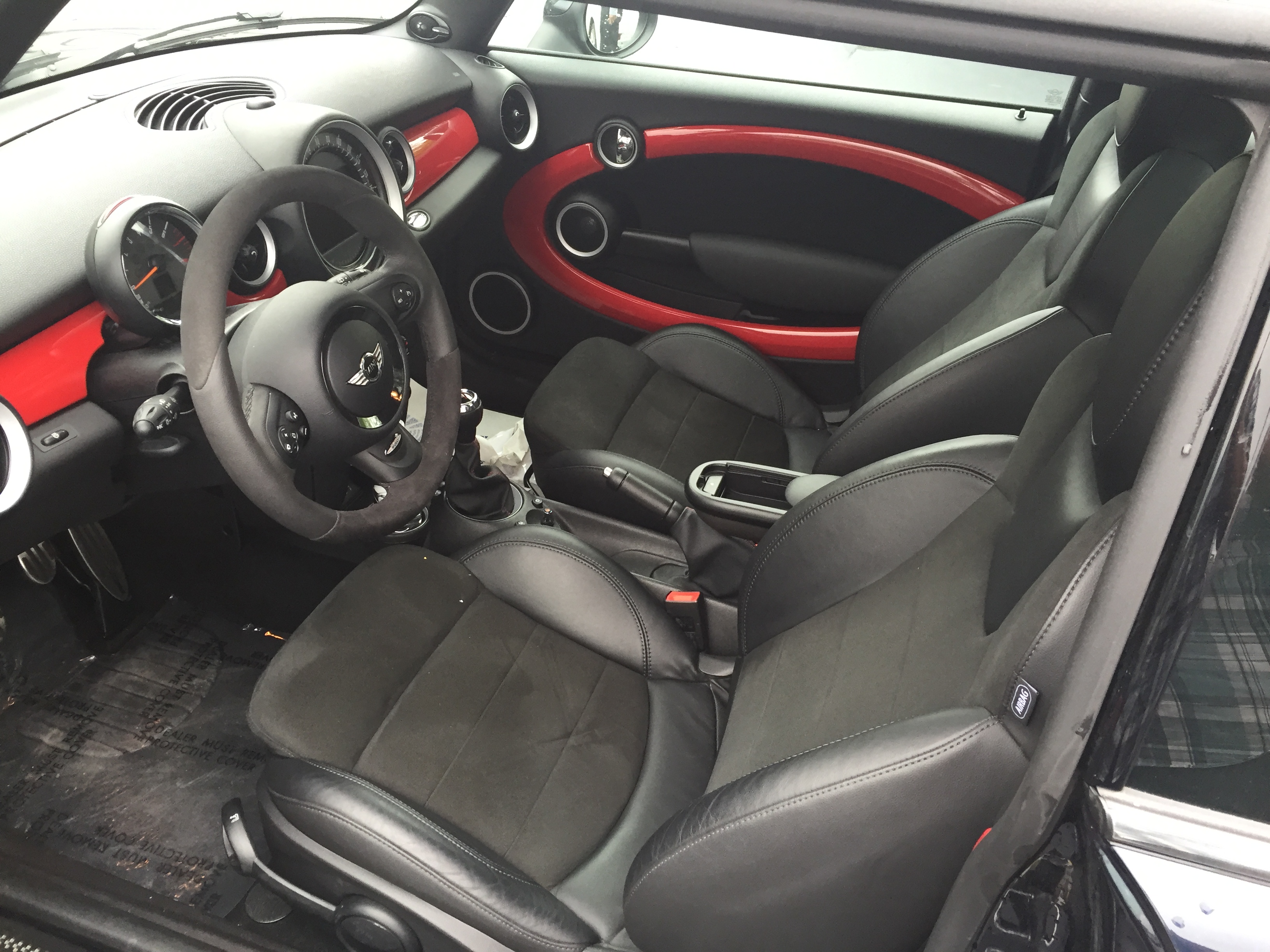 My new used 2013 JCW! White Silver and Championship Red leather. Some cool unusual options include the factory coolant temp and relative boost gauges, the JCW leather/alcantara instrument panel, JCW Strut Bar from the factory, and a full clear bra on the front bumper, hood, door edges, inside of door handles, and rear bumper load edge.