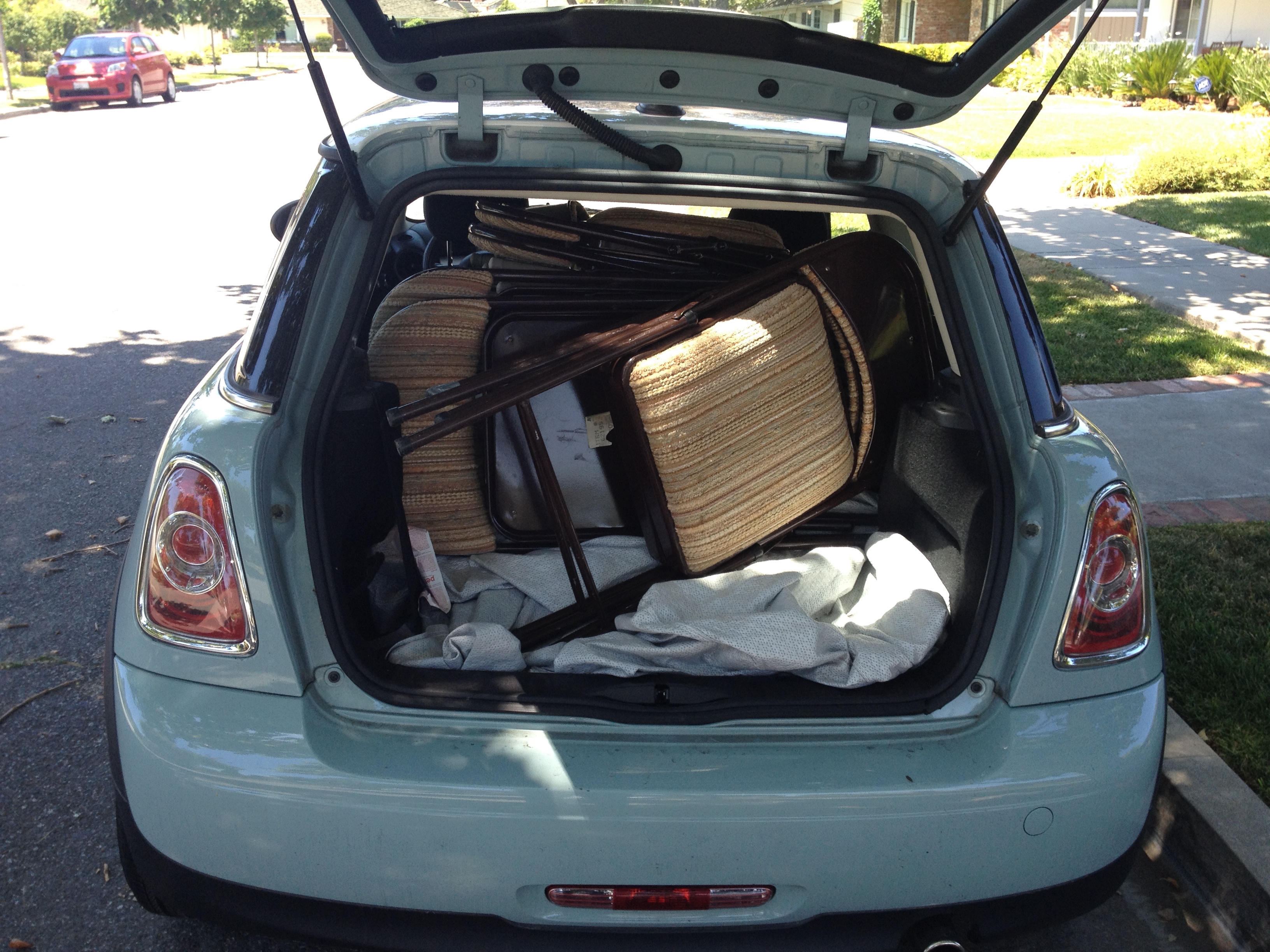 Picked up a dozen folding chairs from a friend's house. I might have been able to fit them all in the back, but I decided that two would go in the passenger's seat.