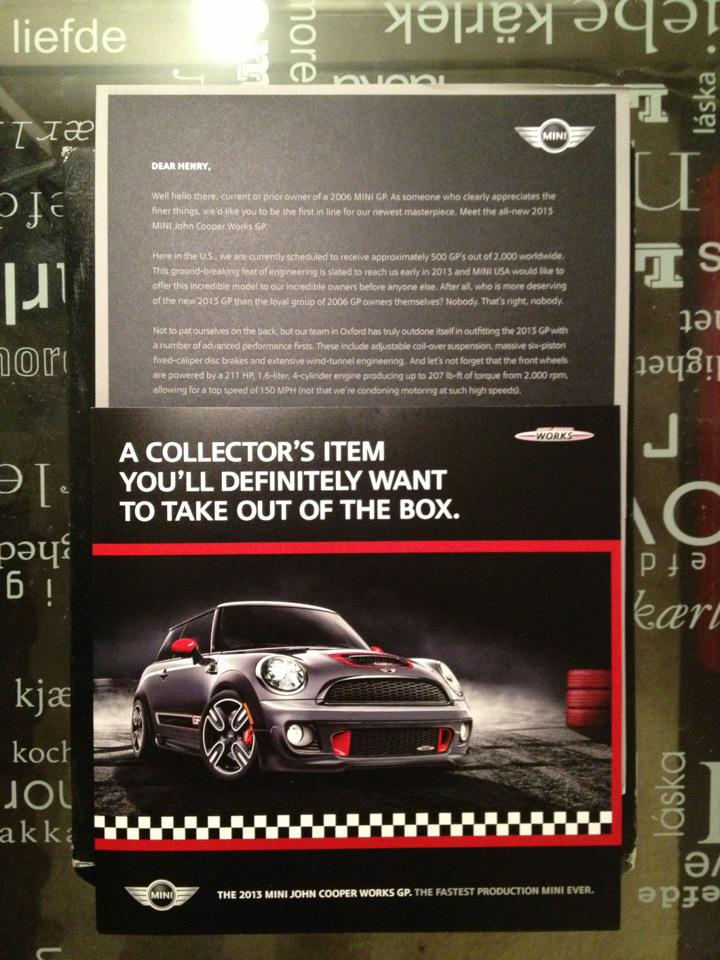 Alas, just one month ago today I purchased a new 2012 Porsche 991 and just can't commit to the MINI right now. I told him that depending on tax time, etc, I might be able to justify it when they arrive in March, but didn't feel like I should "hoarde" his only unit that I potentially might back out on when the time comes.