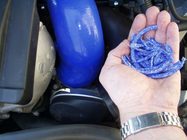 A month ago I posted this hint I found during my installation. I was concerned that the entire weight of the filter was being suspended with the rubber neck on the filter. My paranoia concerned the possibility of the filter popping off when bottoming out in a chuckhole. This hint puts an unobtrusive wire "noose" on the back end of the filter to provide some insurance support. It's a zero cost, 5 minute mod.