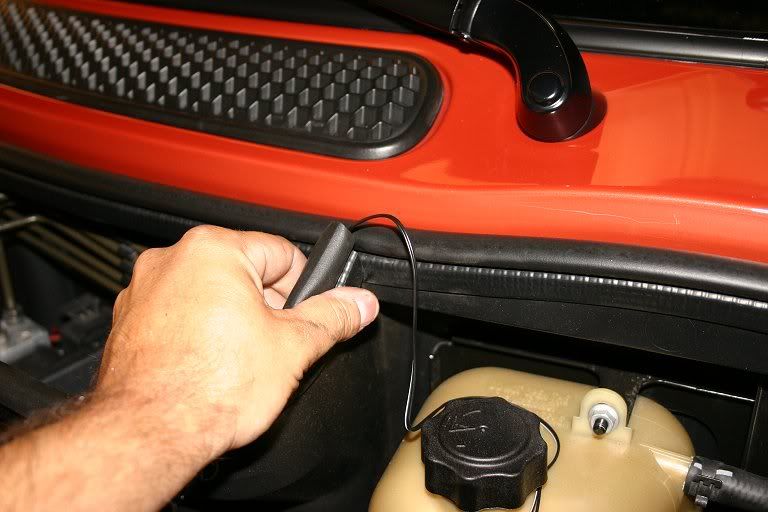 4. Run all your red wires towards the positive battery terminal just beside the air box. Run all your black wires towards the bonnet support on the driver's side - there's a nut there that's a grounding point. You can use the rubber sealent stripping on top of the air box dam and near the bonnet seal to stealth the wires - just pull it off, stuff the wires into the strip using a spoon or chop-stick (not a screwdriver, which can tear the wiring cover) and replace with the wires safely stowed inside: