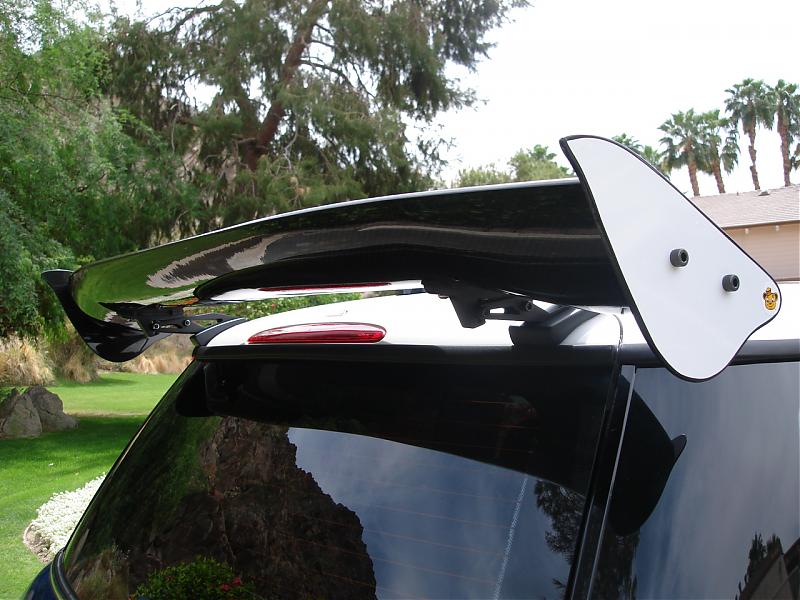 This is what you get when the worlds stubbiest antenna meets the worlds biggest rear spoiler. The fact is I had to grind it down to clear the wing when the hatch is wide open. The good news is it still works (the antenna). I'll let you know about how well this mombo wing works when I shake it out in the local twistys.