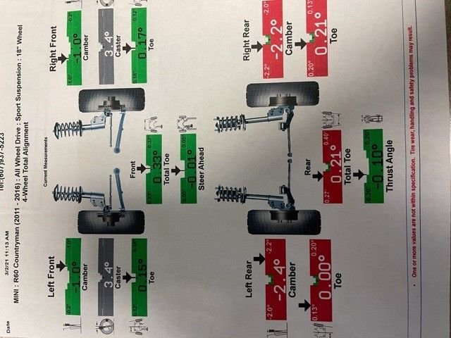 I am not sure about the toe in either. The mechanic that was doing it is not very familiar with the Mini platform so I am not sure if he missed something to adjust on it. There are not many places nearby to get alignments, so I am limited to where I can take it and the closest dealer is an hr and 45 mins away. Is it normal for the countryman time have aggressive camber? I may end up getting adjustable control arms to get the camber in line. Is the toe being off a cause for concern?