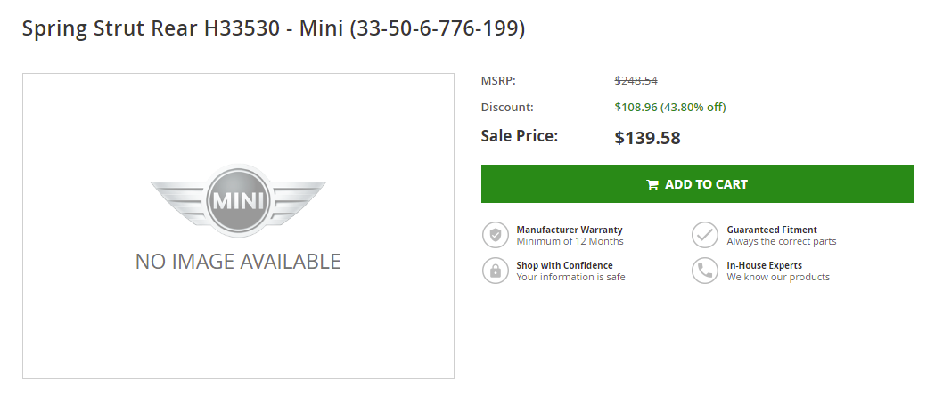 Thanks for tuning in ECS. Wrong shock though, that is a sport suspension strut, I am looking for 33526768412 or 33506776199 (both are actual JCW shocks.).