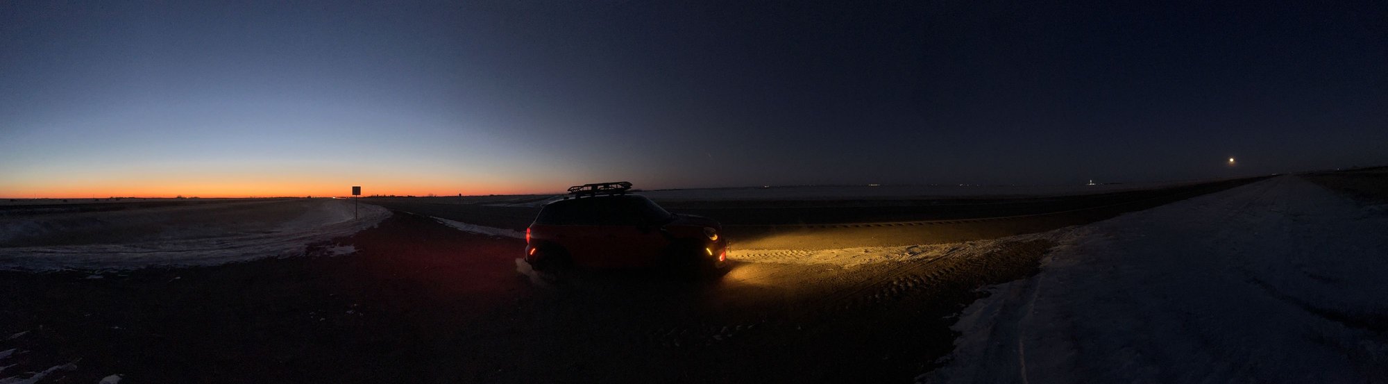 Grabbed a cup of coffee from the hotel and it was crap, BUT better than every cup I had in Wisconsin by miles, figuratively and literally. Started driving @ 6am up a 2 way road. Empty roads lead to poor speed judgments (aka doing 80 in a 55) about 40 minutes in a wonderful, beautiful athletic deer decides to hop on to the road directly in my path. My track survival skills kicked in and swerved onto a narrow shoulder, barely avoiding the ditch and bounced around pretty hard, downshifted throttled up went sideways but managed to get back on the road. The car felt smooth so I continued to the next gas station. I checked under the Mini and didn’t see any damage, leaks etc. Checked under the hood and did my best to see the lines that go under the car and again nothing seemed out of place and I didn’t smell any fuel or oil then again it was -22 degrees Fahrenheit, like I could smell anything at that temperature. Continued up and entered to Canada through Portal, ND. After going through the scrutiny of USCBP they went through the car in search of contraband and reported nothing of interest. I continued my way up to the Trans Canadian Highway at this time Waze had my only 6 hours away from Calgary putting me at 32 hours of the initial 39 hour drive.