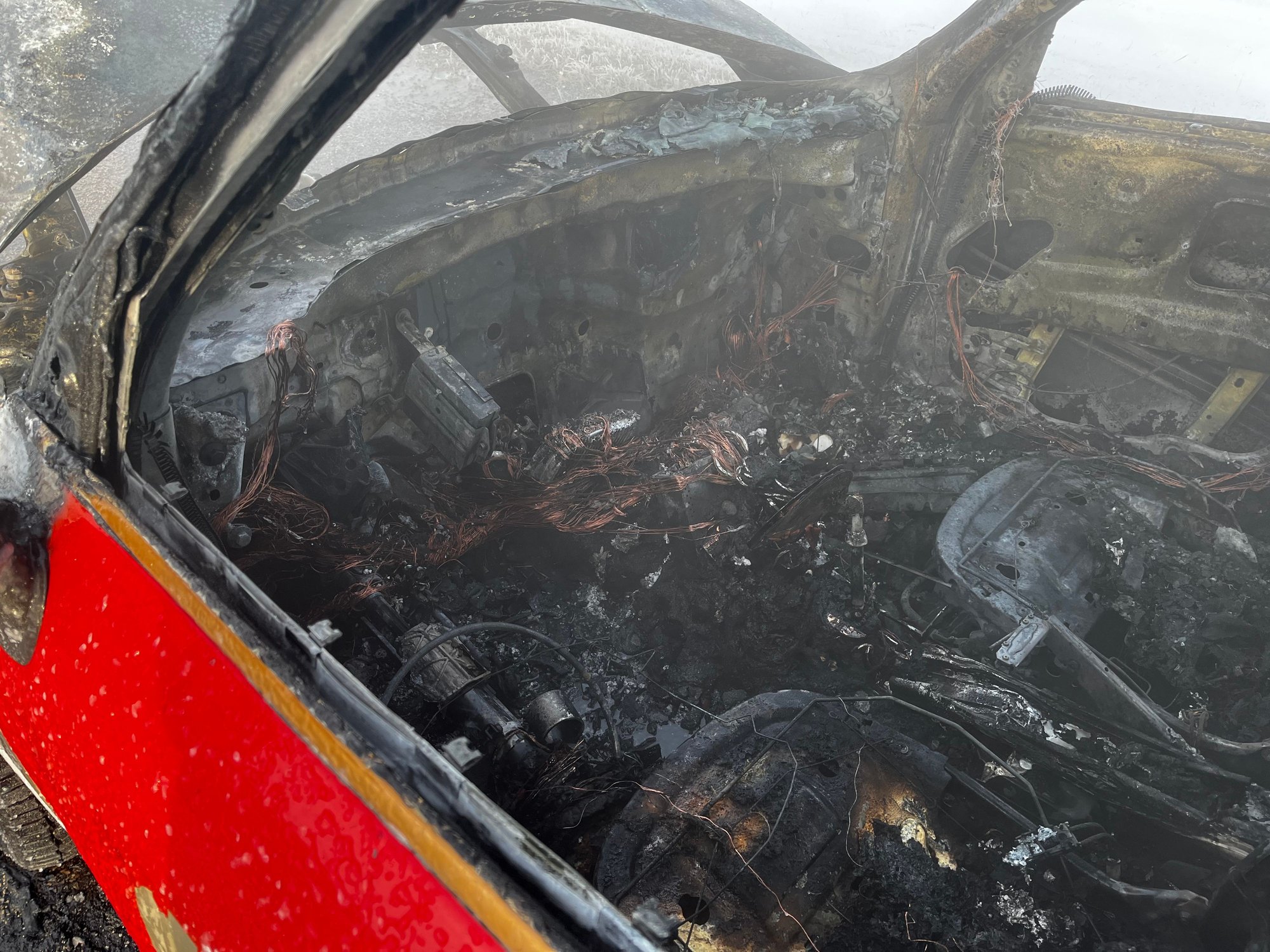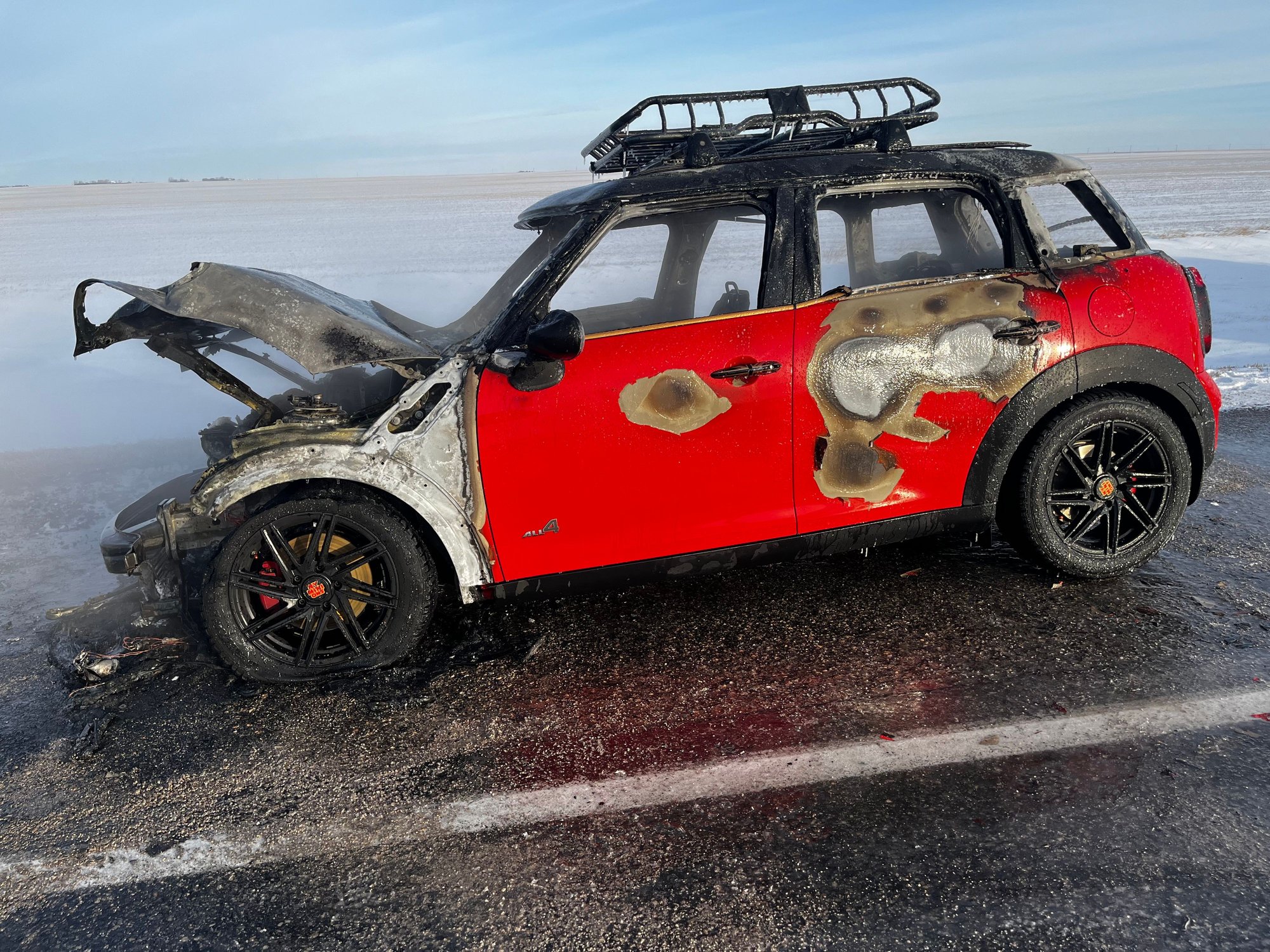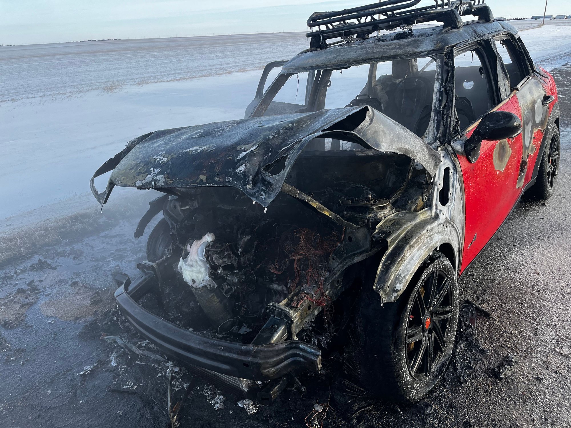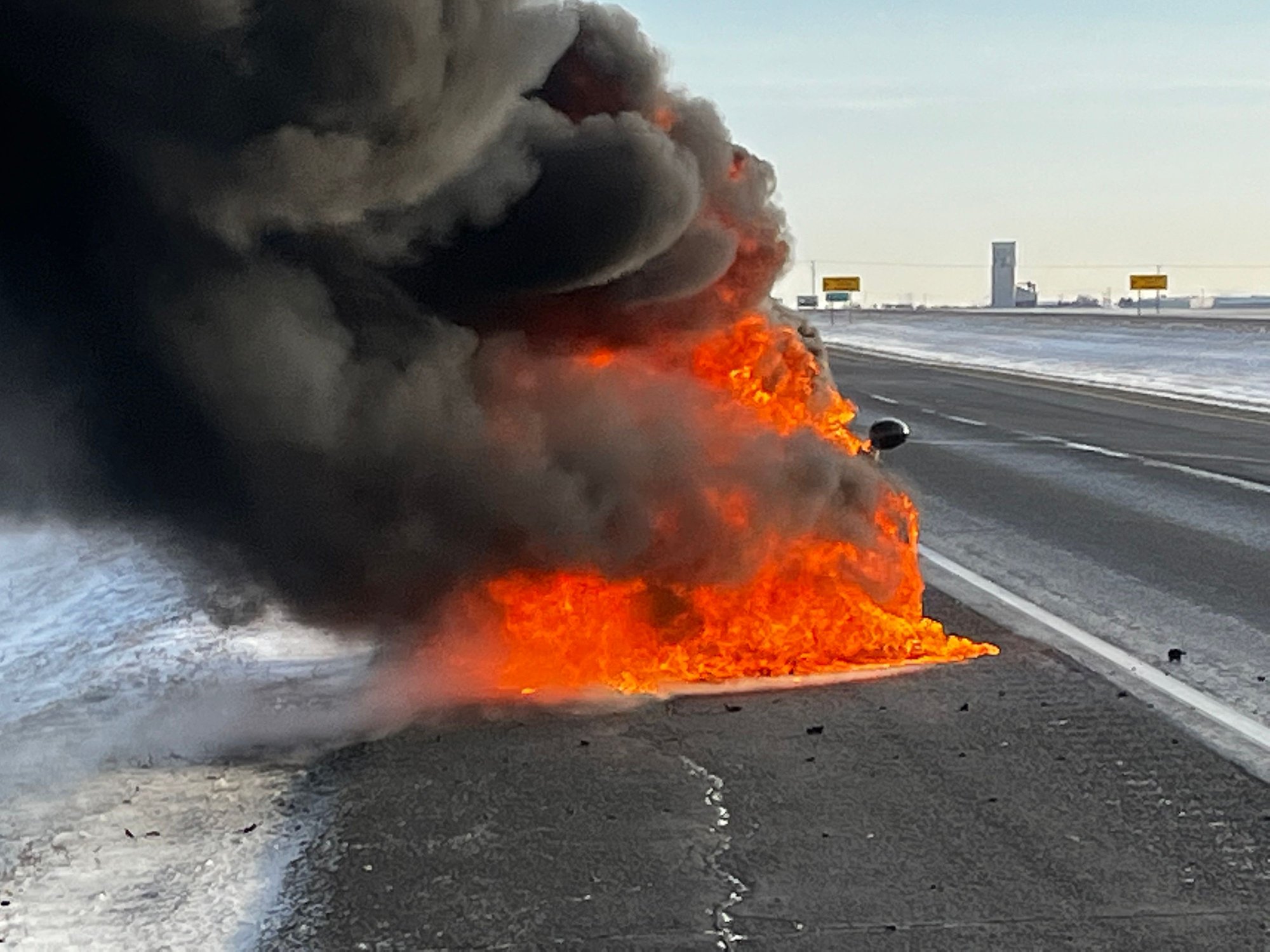 I finally made it to the Trans Canadian Highway and minutes after arriving and passing Moose Jaw, I smelled smoke and since I was passing and industrious area I thought it were my surroundings. I rolled down the window to make sure, but when I did, a poof of smoke came through the vent and that was my holy **** moment. I quickly, without wrecking, pulled onto the shoulder, but while doing so the car’s engine and power cut out and that’s when I saw the flames. I pulled the e-brake and the car barely came to a stop when I pulled out of the car. At this point is when the weather reminded me it was -19 degrees Fahrenheit. Grabbed my go bag cause all my identifications were in that bag and grabbed my phone and left everything else, hat (tuq?), scarf and gloves that were on the floor of the back seat. Within a couple of minutes the Flames had the whole front of the car. At that time a couple of Canadian Long Haulers pulled over and tried to put out the flames with fire extinguishers and the fire just laughed. So I had one of the truckers break the rear window and got my suitcase out. Just a few minutes later, nothing but a ball of fire.
