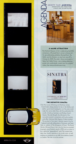 ....anyway, the July '05 Vanity Fair ad on p. 66 is not an insert. It's vertical and shows a napkin, a 3 x 5 inch note card, a dry erase board with an eraser and markers in the well and.......ta da.....a Y/W Mini poking out of the ad.