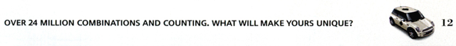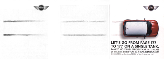 I got my August/September 2005 issue of Metropolis magazine today. There is a MINI ad spread over 31 pages of the magazine! The ad begins on page 12 with the line: OVER 24 MILLION COMBINATIONS AND COUNTING. WHAT WILL MAKE YOURS UNIQUE? and a tiny white MINI next to the page number. Then randomly throughout the magazine there are different MINIs next to the page numbers at the bottom of the pages. The ad ends on page 166 with a small MINI logo and an all-white MINI.