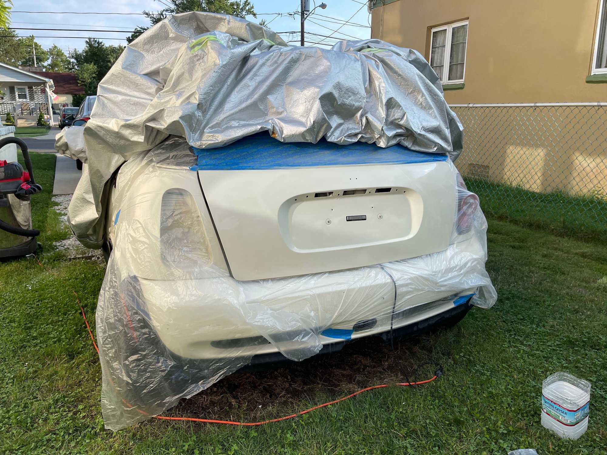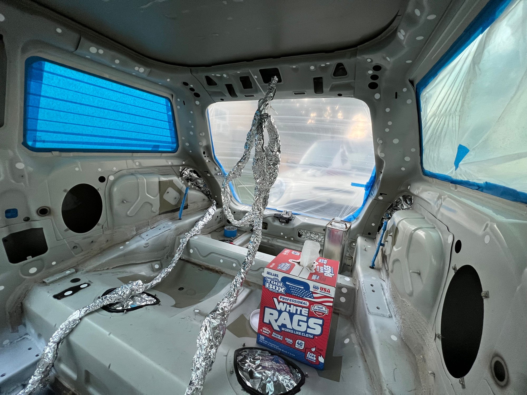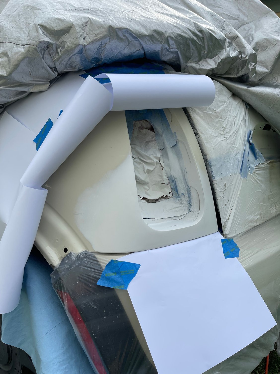 The body rear had typical rusty spots for a salt belt car, so ordered several cans of pepper white and 2k clear coat to stave off further damage.