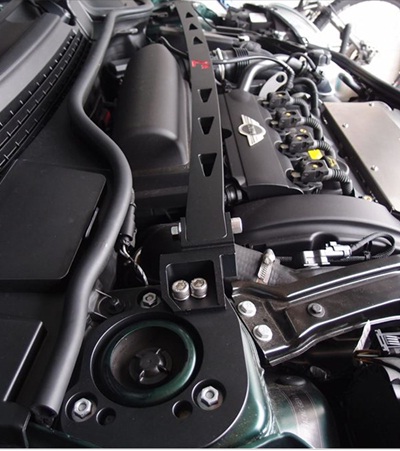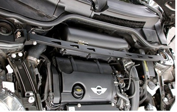 M7 J Brace Strut Tower Brace for 2007+ R55, R56, R57 R58, R59 MINI Cooper S. If you have the JCW John Cooper Works intake on your MINI, this strut tower M7 J-Brace is exactly what you need. It helps to protect against mushrooming of the strut towers, and provides some added stiffness to the front end. In addition to the JCW intake, this brace will also work with many other aftermarket intakes. It is a solid CNC-machined aluminum bar.