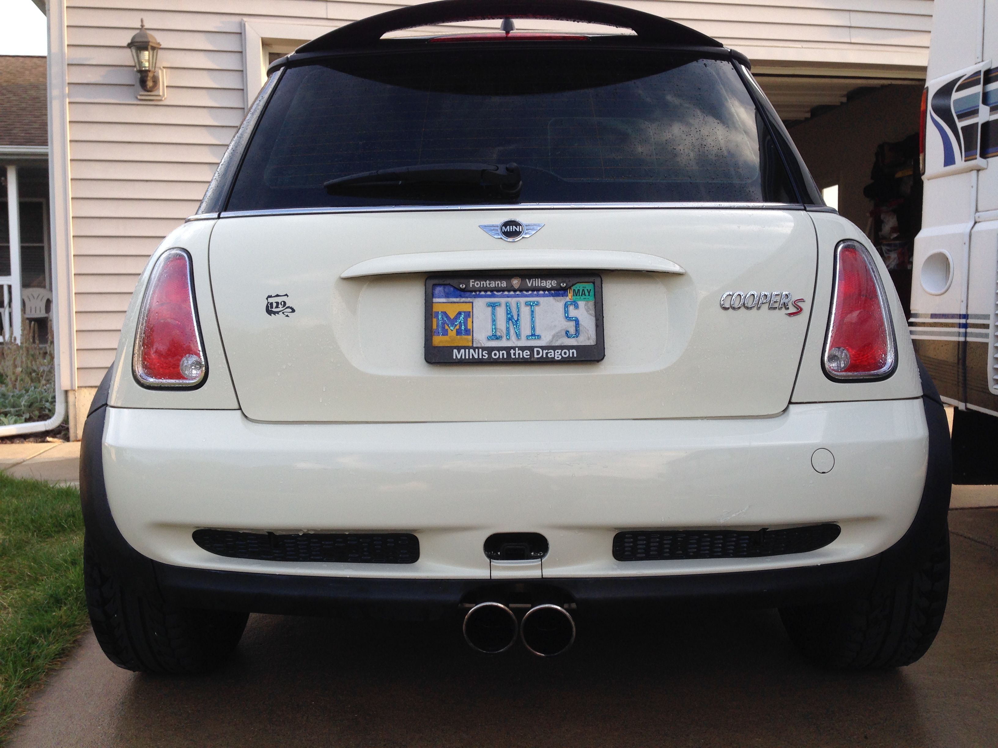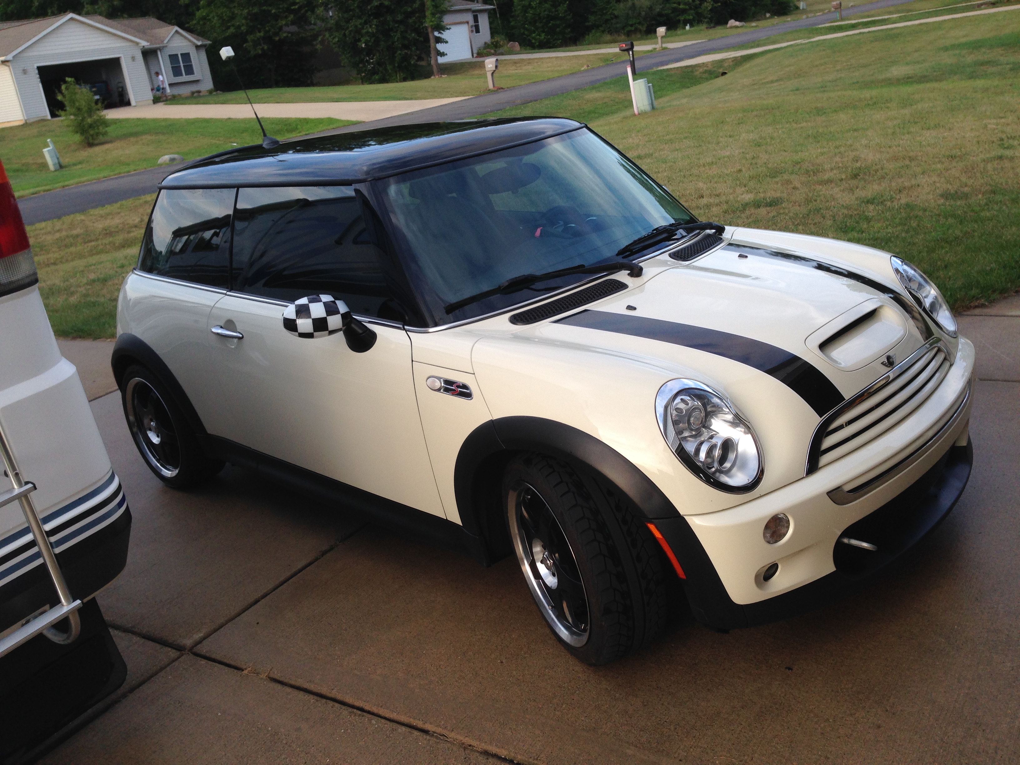 Black over pepper white color scheme, black & white checkerboard mirror caps, cold weather pkg, premium pkg, sport pkg, Steptronic, chrome line pkg, cockpit chrono pkg. dealer-inst MINI armrest, 15% smaller supercharger pulley w de-restricted factory air box, Volt stainless steel low restriction dual exhaust, trailer hitch receiver. rolling on good BGF g-force Sport 205/45ZR17's