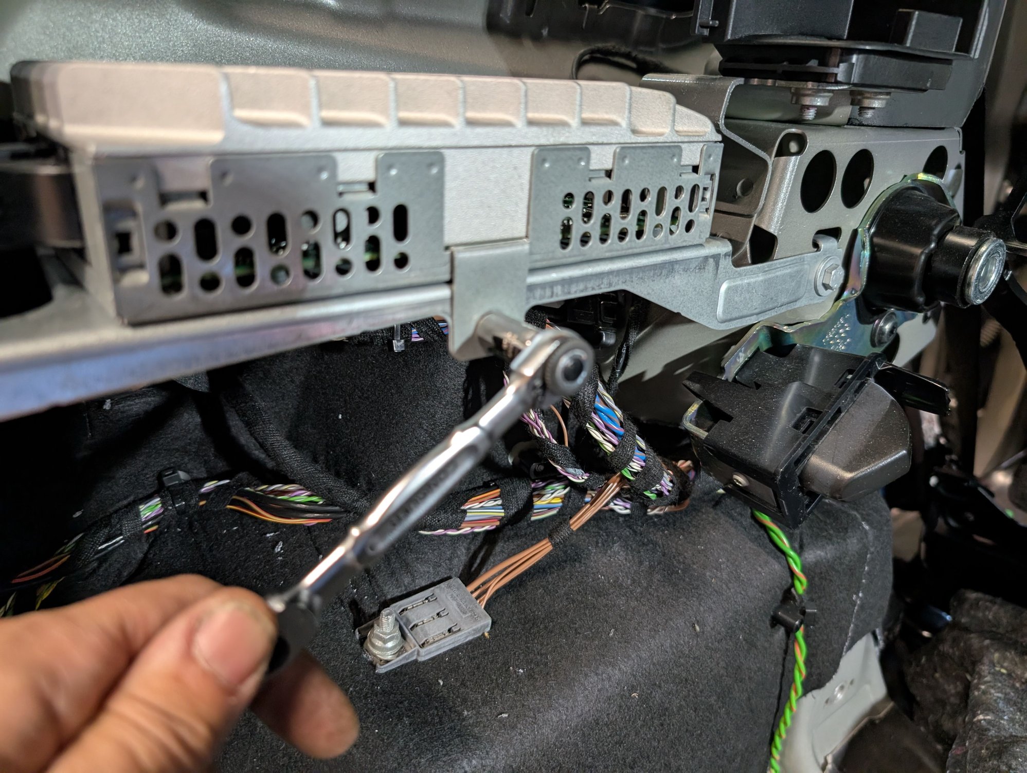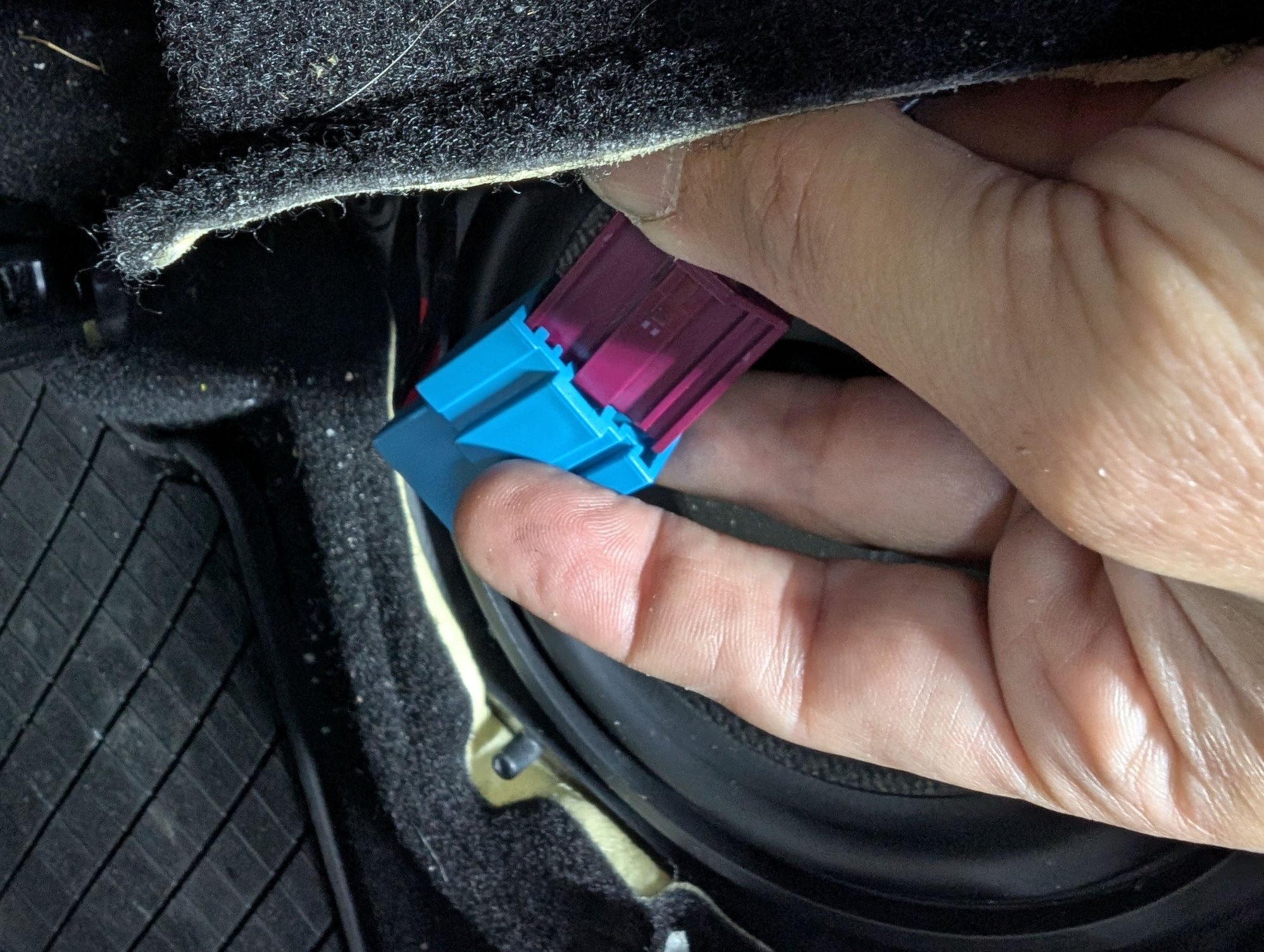 I apparently didn't take any good pictures of pulling the wire - I have a flexible rod that I pushed through the opening, and in my case here I pulled the wire through from my driver's footwell area by taping the wire to the rod. My wife had to help me here, because the square wire was getting hooked in the round hole.