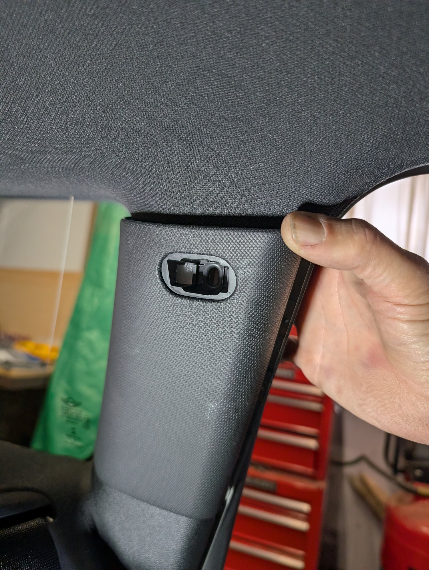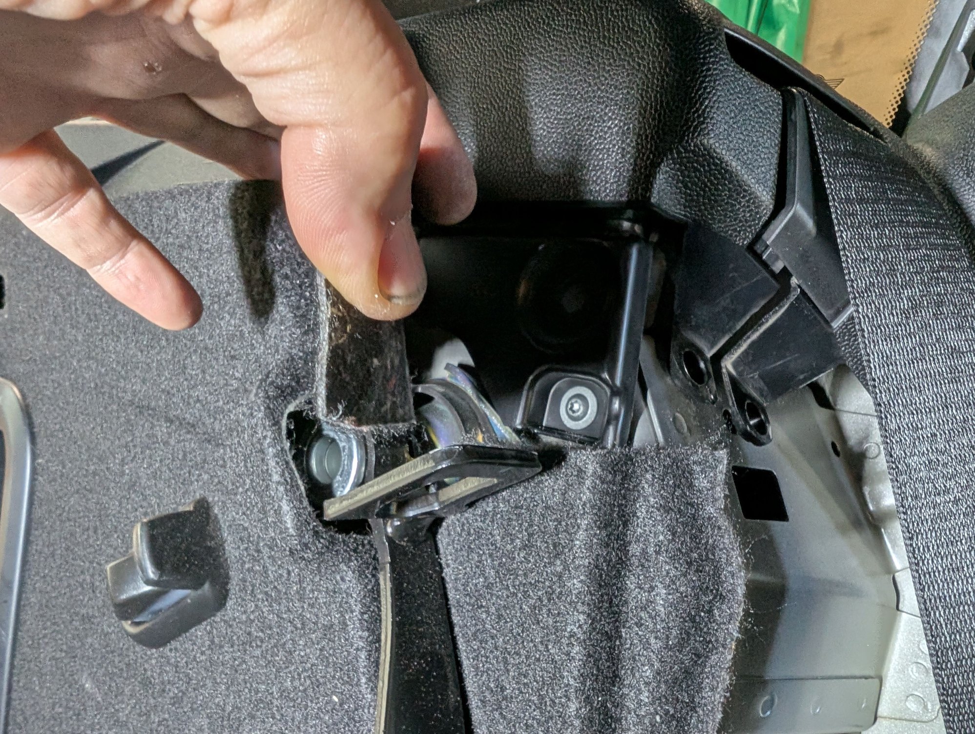 With that screw removed, you can start to lift the upper portion of the side hatch panel. You do NOT need to loosen or remove the larger torx bolts where the privacy cover clips in: