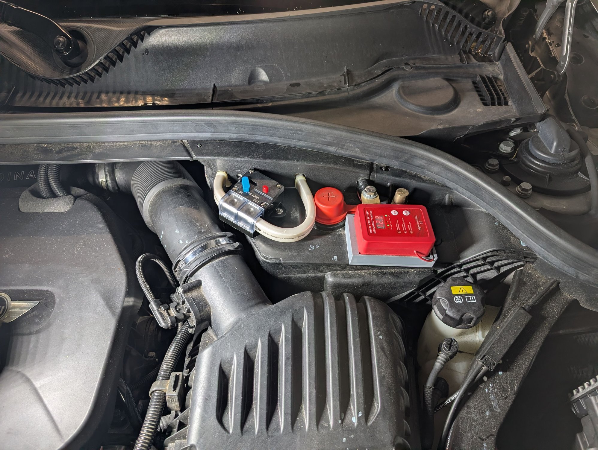 I then routed the wire back up above the battery, made a few small cuts in the panel above the battery so I could secure a 200A breaker to that panel, routing the wire to the output of the breaker, and then a short length of wire from the input of the breaker to the positive of the battery - conveniently, although this rectangular Ixos wire ring terminal was very thick, one of the two bolts on that positive bus at the battery terminal was plenty long enough to secure it: **IMPORTANT NOTE** - the red box is a battery shutoff that I installed when I bought this car, mainly for the convenience of doing electrical work on my car - I can press "off" and the battery disconnects - just like removing the negative cable off the battery. it also has low voltage protection so it disconnects if my battery voltage drops too low - a nice side benefit.