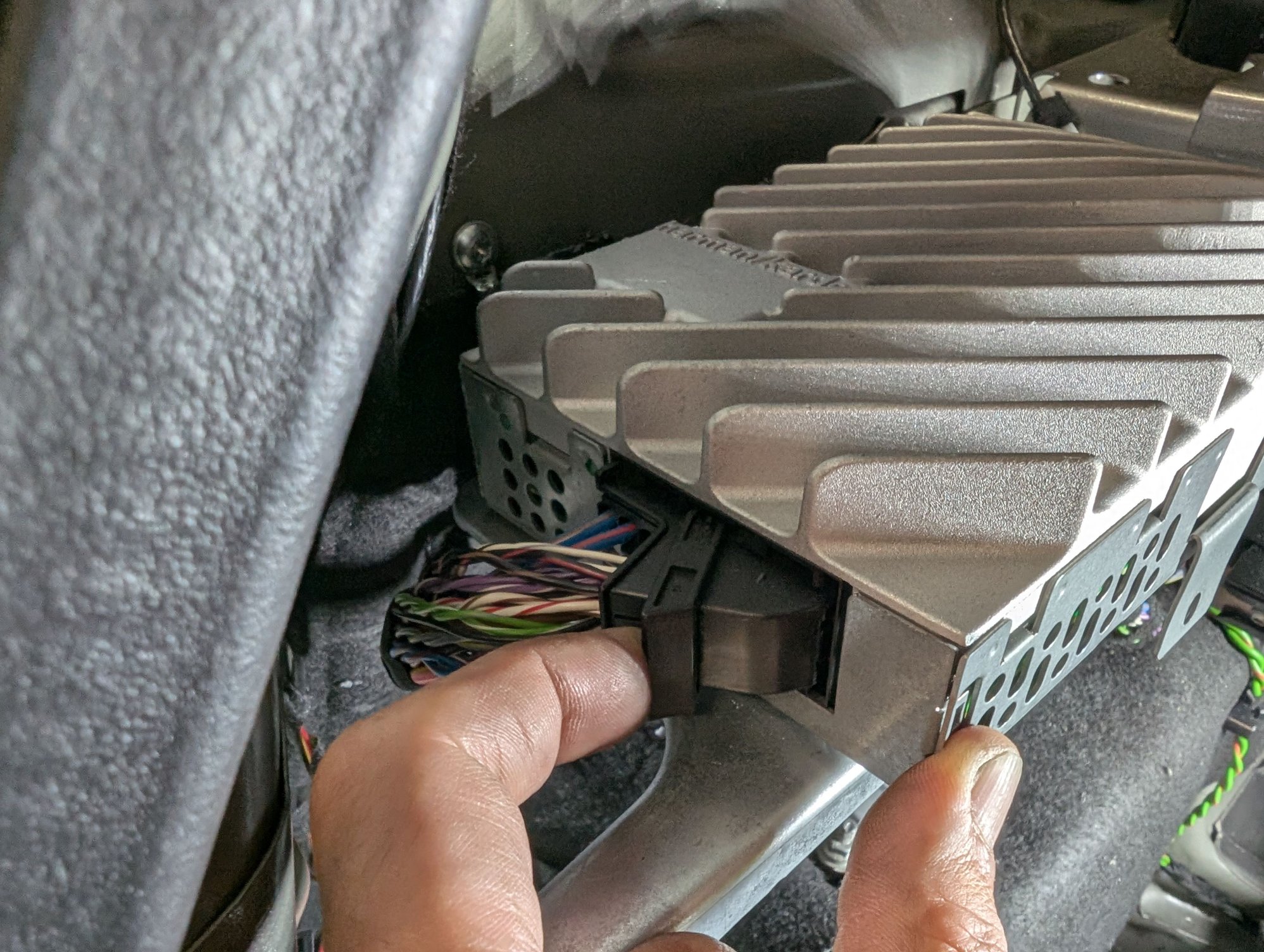 Then you bolt on a panel that matches the mounting system of the F54, supplied with the amp. Also supplied with the amp is a wiring harness adapter, which plugs into the amplifier, and then plugs into that fancy swing-arm factory BMW plug on the other end. Very straightforward.