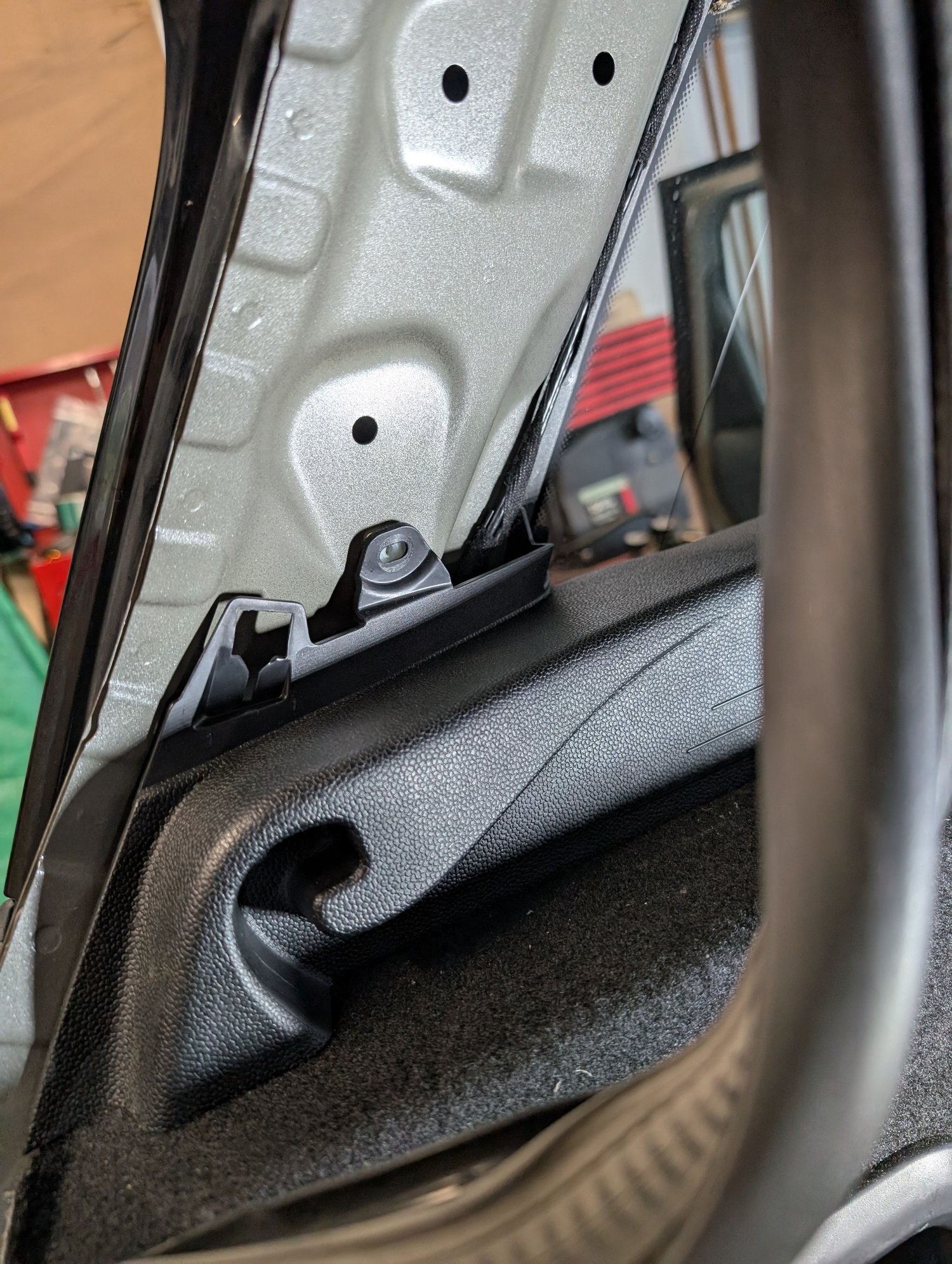 The plastic panel next to the window needs to come off. With the hatch doors open, pull the weather stripping and if you start to pull it with your fingers, you'll see two of the pressure clips that are holding the panel on. Use a panel tool to pop it off. No screws holding this panel on.