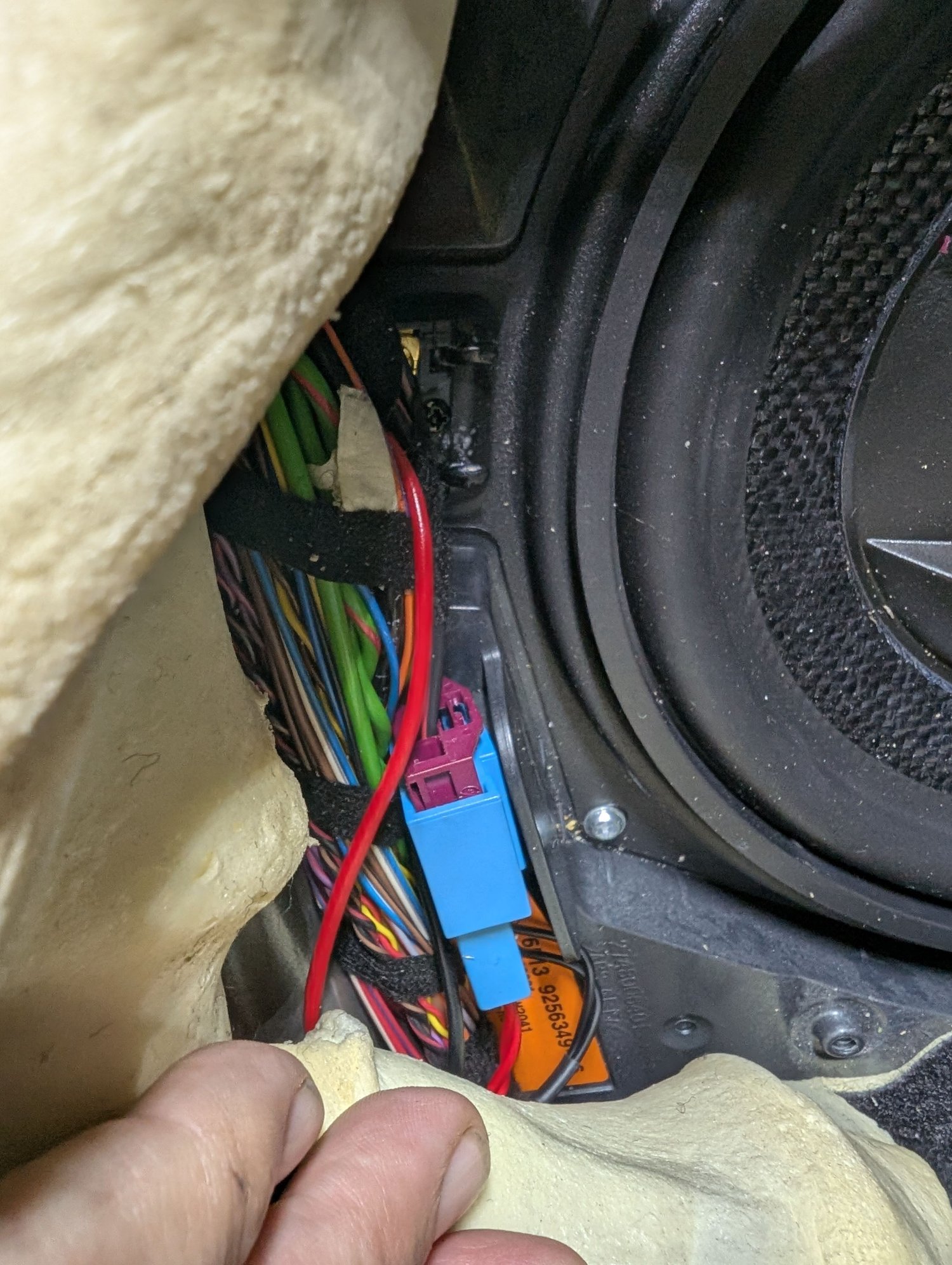 Then, I just tilted the seatback all the way forward, and topped the seat back. The yellow plug, I unclipped from the underside of the seat by sliding it back, that allowed the seat to tip back and balance backwards while I worked so I didn't have to unplug the harness. That gave easy access to the speaker grilles: