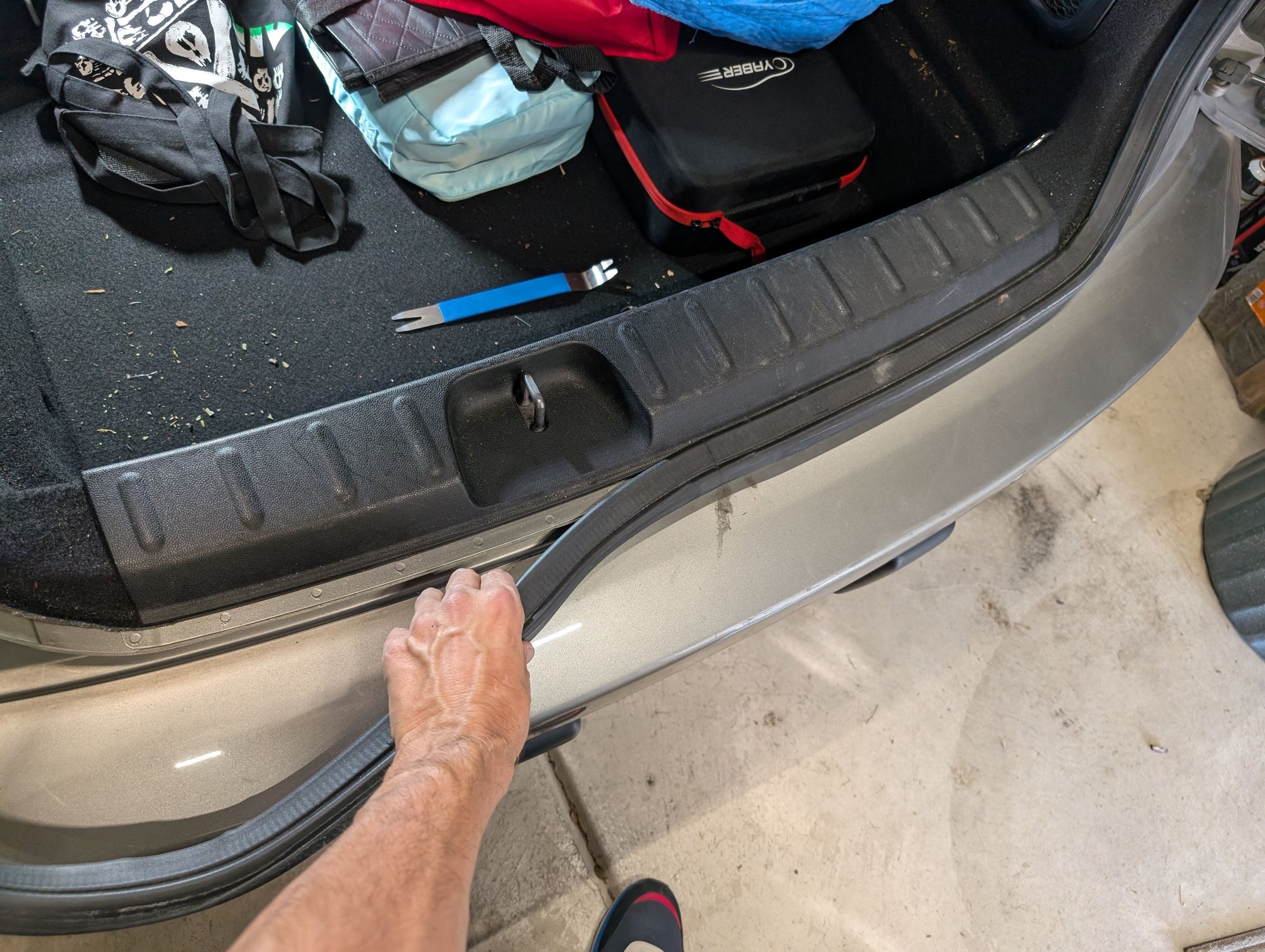 You just need to peel off the weatherstripping then, that's all that's left holding the rear hatch sill in place. It'll just lift out after the weatherstripping is removed: