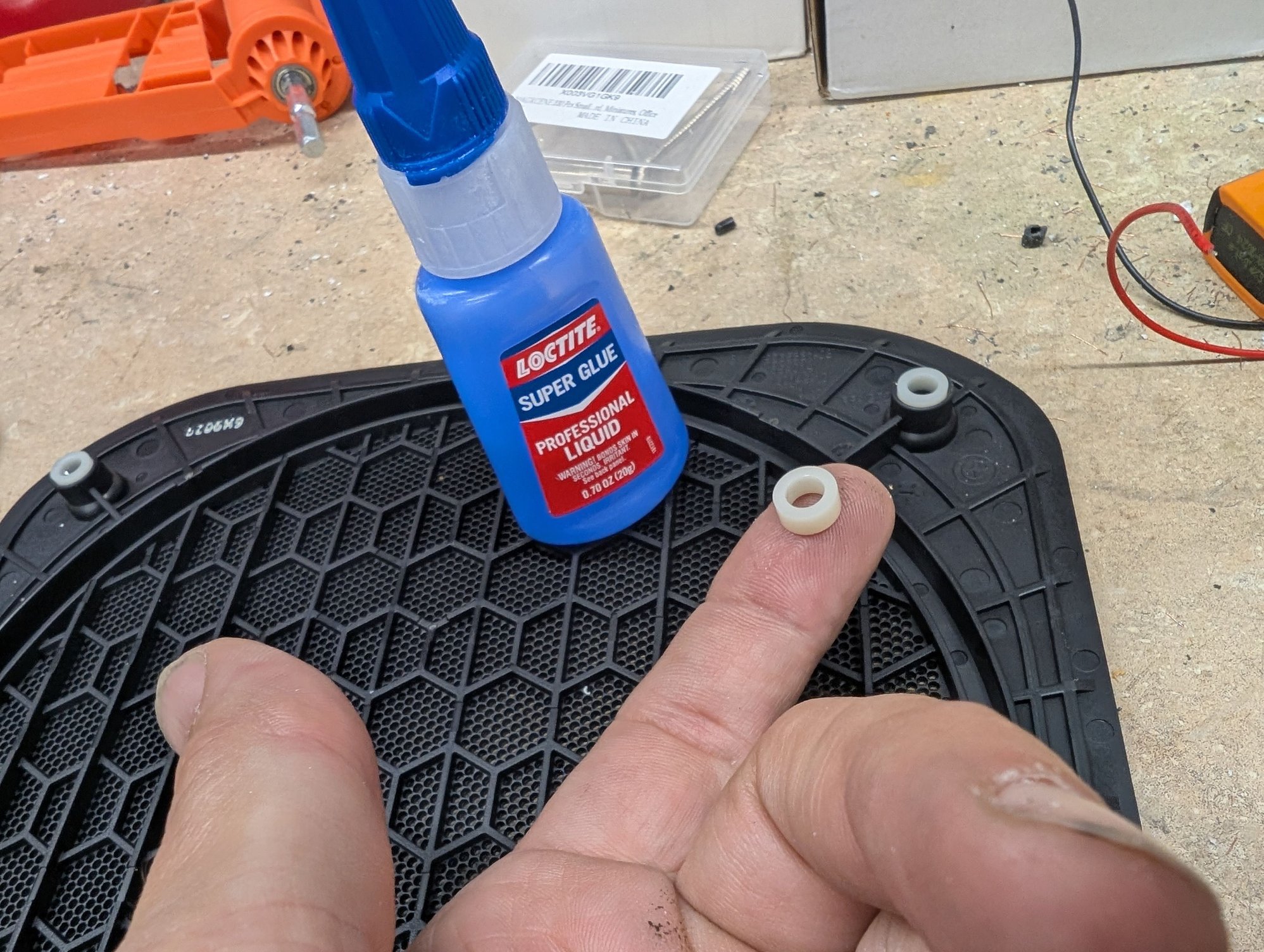 I chose to use a dab of super glue on each - imagining the Murphy's Law scenario where you go to install the grille, one or more of them fall out, and lodge themselves somewhere impossible to find in one of the voids under that carpet, between the speaker... Don't take chances. Just glue them in, then they can't fall out.