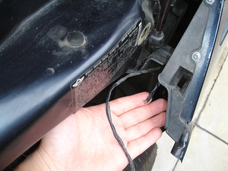 I was working on my project today. I saw this on the driver side in the side panel. I am guess this is the wiring for the headlight washer system. It is cut.