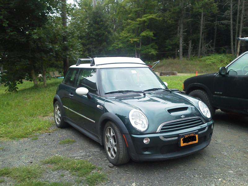 I just finished doing the install on the factory Mini roof rack. It was a bit nerve racking at first, but after the first hole I developed a technique and it wasnt too bad. I then took a Yakima fairing and painted it with the Fusion plastic paint white. It was the look I was going for, now I just need to get some bike and a ski rack for it. Anybody have any advice on a good bike tray for it and a nice ski rack?