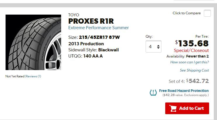 I originally wanted the Toyo Proxes R1R but it doesn't look like Tire Rack is carrying them anymore
