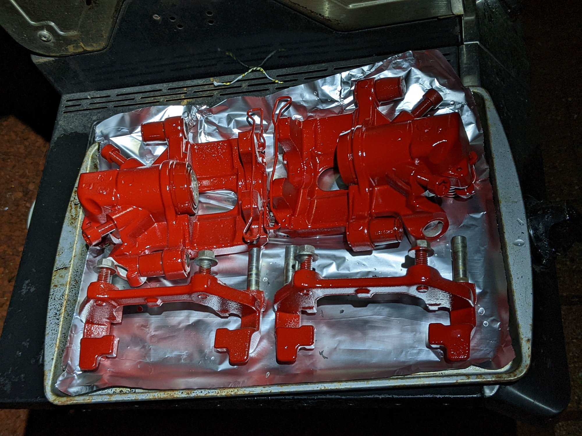 Rear shocks have been assembled for weeks waiting for rear sway bar to show up :( Rear calipers before shotblast Rear calipers after shotblast and ready for paint VHT real red applied and baked in my grill. Front calipers tidied up and assembled. Superpro transmission mount inserts. Bluetooth/SD card/Aux module installed!