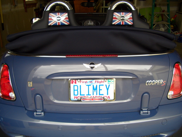 Here is a (not very good) pic of my headrest decals(darn shadows!). I went Orange/Black to match my car, and put the MINI Wings on them for a little contrast. They weren't able to match the MINI Hot Orange perfectly(which I knew up front), but I am still very happy with them.