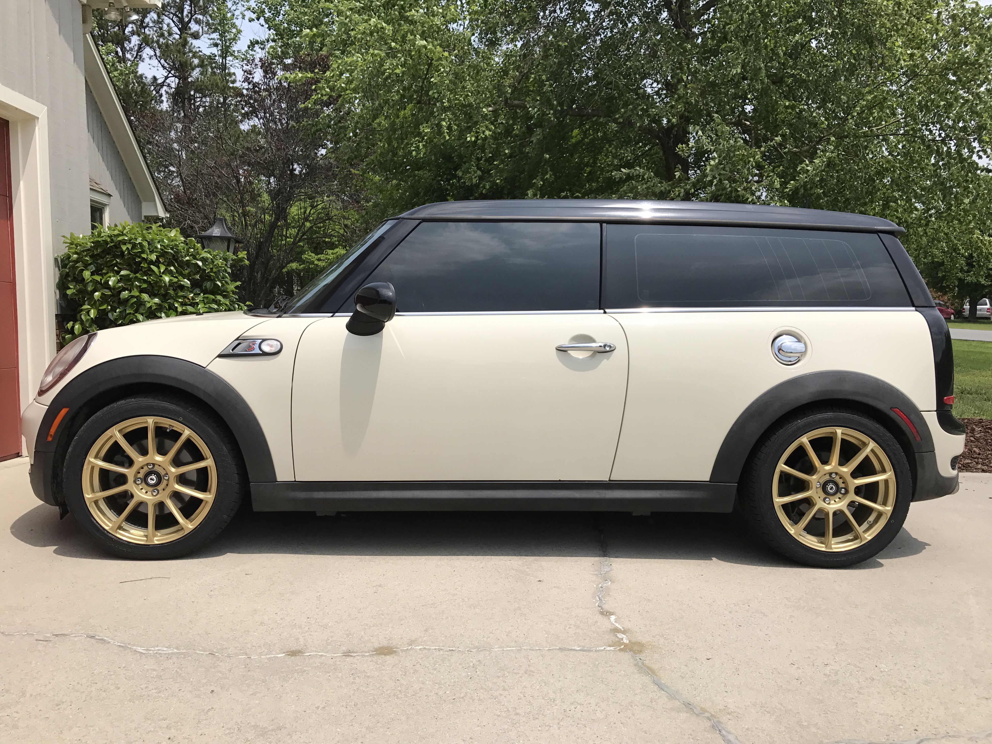 Here is my 2010 Clubman S with a little less than 8500 original miles. So far has a turbo blanket, AEM intake, MM 22mm solid rear sway bar along with R95 wheels running 215/45/18's on all four corners along with 12mm spacers on all four corners and Magnaflow CAT back.