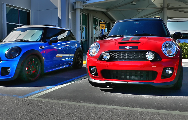 After a few more hours in Red, I'm really starting to appreciate the slight increase in ride height. I can think of a half dozen or so places here in Austin (including my driveway and the parking garage at work) where I would whack the R53's chin EVERY SINGLE TIME. Haven't scraped the R55's air dam once!
