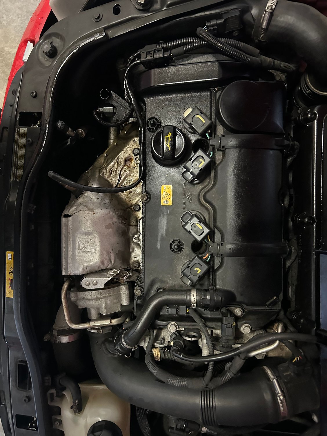 Daughter has had the clubbie at school. When she got home yesterday I smelled something. Checked wheels and all were cool. This morning I see oil spots on the driveway. Pull it into the garage and open the hood to this.